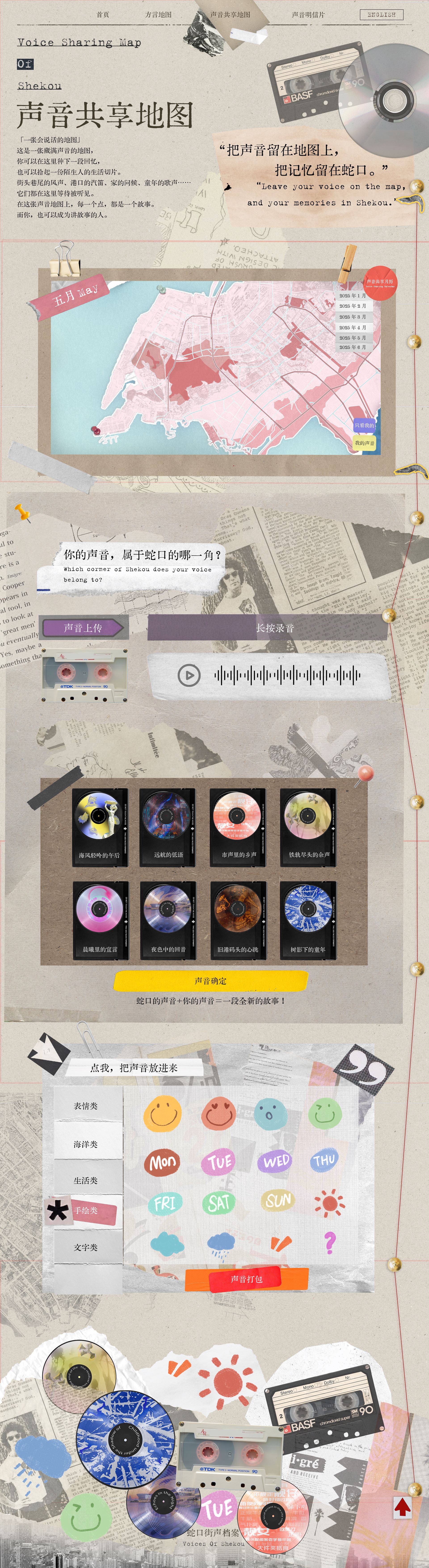 "Voices Of Shekou" is an interactive website that combines sound and video to preserve and showcase the city's memories. The "Voices Of Shekou" is an interactive website that uses sound as the core medium to preserve and showcase the unique urban sounds, historical images, and local culture of the Shekou area. The project starts from the question of whether sound can serve as a carrier of urban memory, focusing on the daily sounds, dialectal contexts, and life threads that are gradually being forgotten under the rapid spatial transformation of the city.