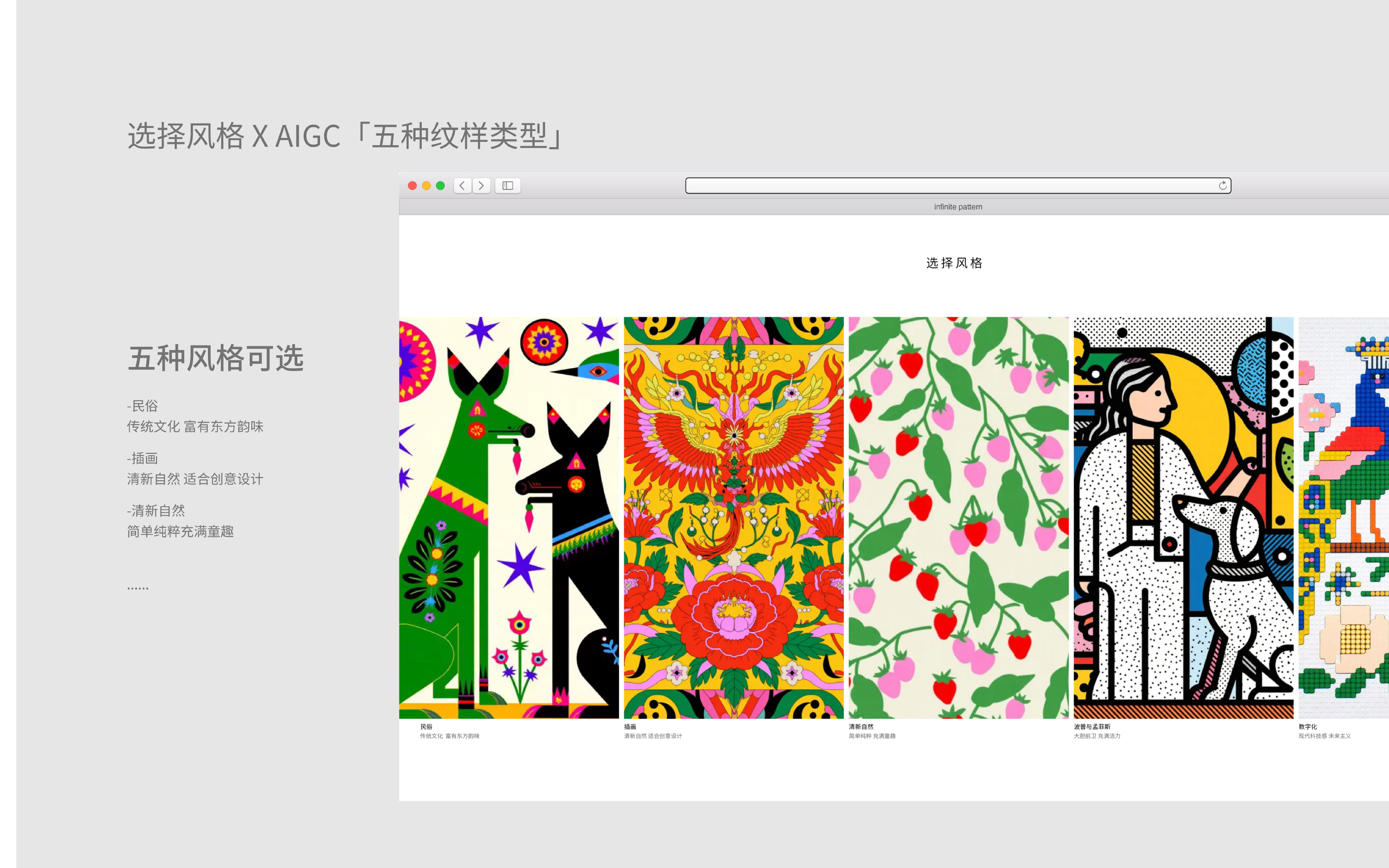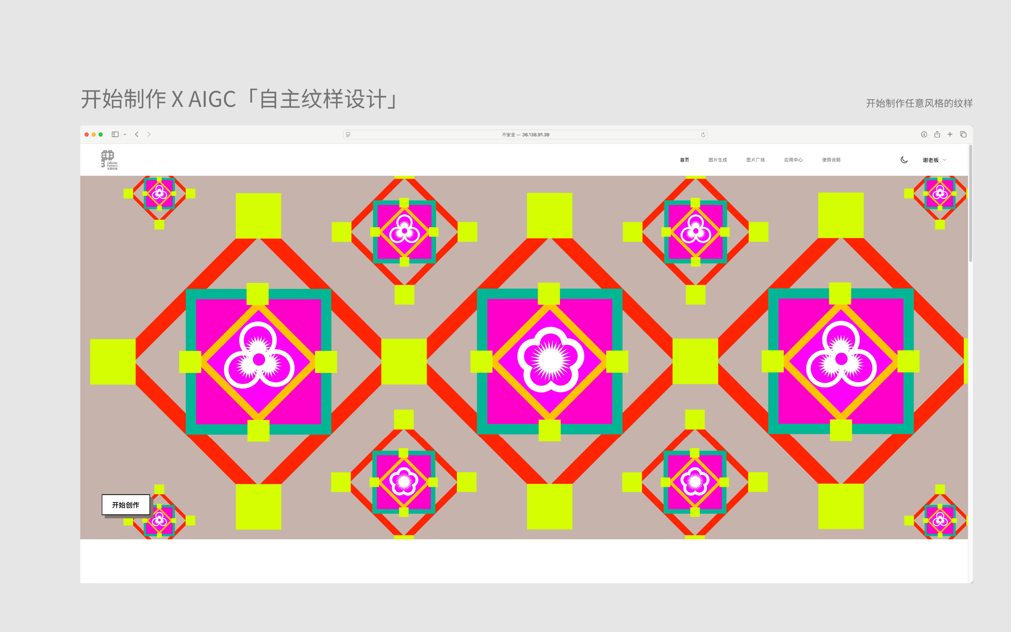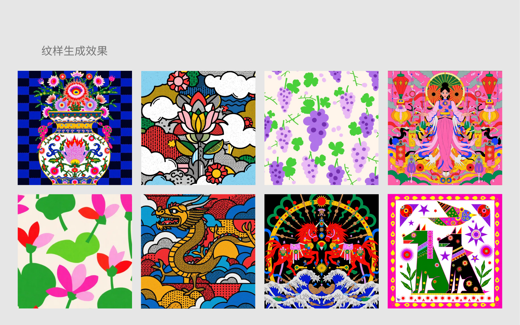 "Infinite Pattern Realm" is an intelligent pattern design platform that integrates generative artificial intelligence and style transfer technology, and is a phased result of the "Ministry of Education Humanities and Social Sciences Project". The platform builds a complete tool chain from "pattern recognition to pattern generation to editing design to application transformation", a platform that integrates creativity and application, so that users in non-art and design fields can also realize creative generation and output high originality and personalized pattern design. The platform can connect with the production lines of textiles, furniture, cultural and creative products, realize the active application of traditional patterns, shorten the design-sample-launch cycle, and save sample costs. The platform opens the database of traditional patterns and the low-threshold interface of "text-to-image/image-to-text" to allow the public and non-design professional groups to participate in the creation of patterns, thus enhancing cultural identity and aesthetic education.