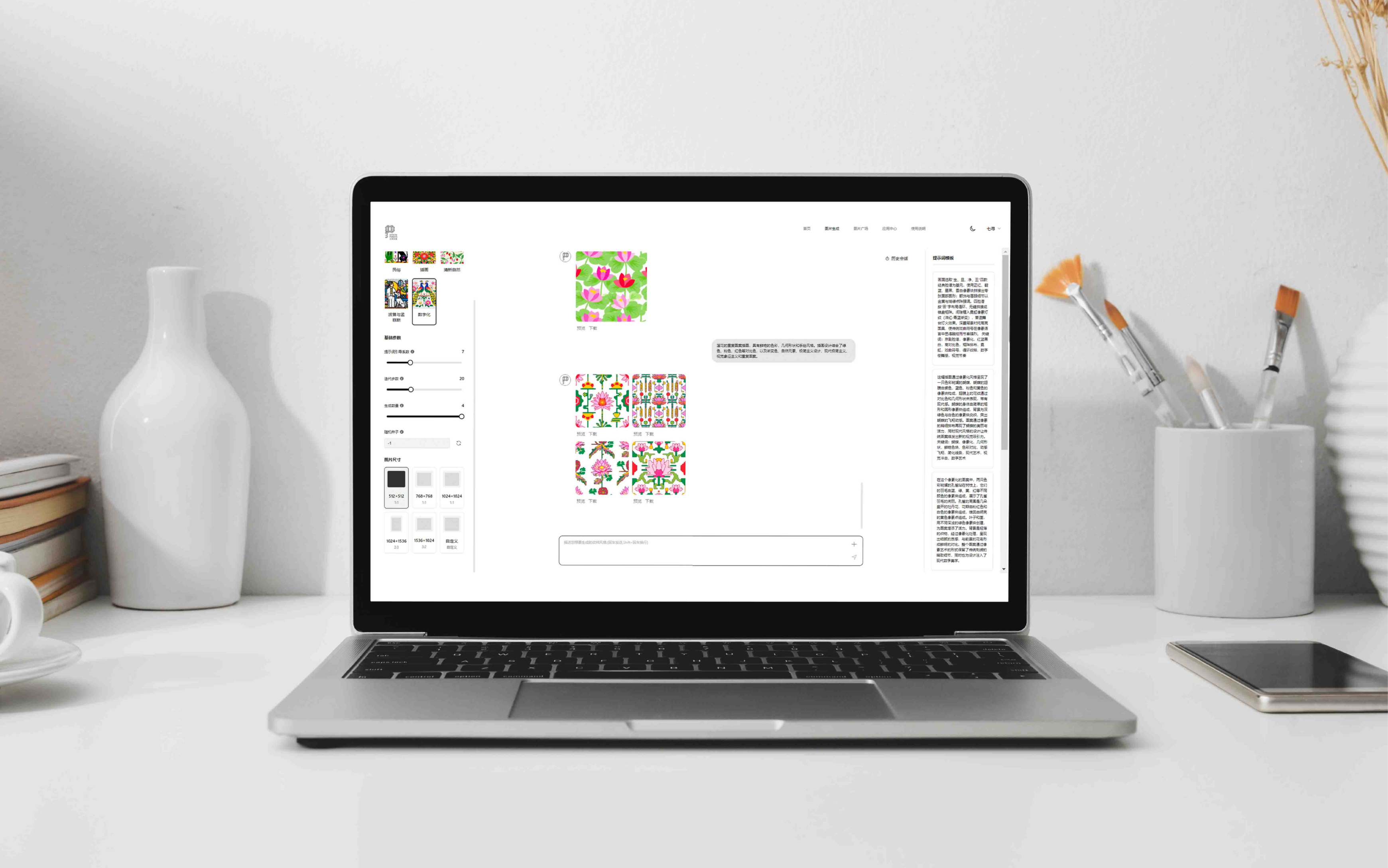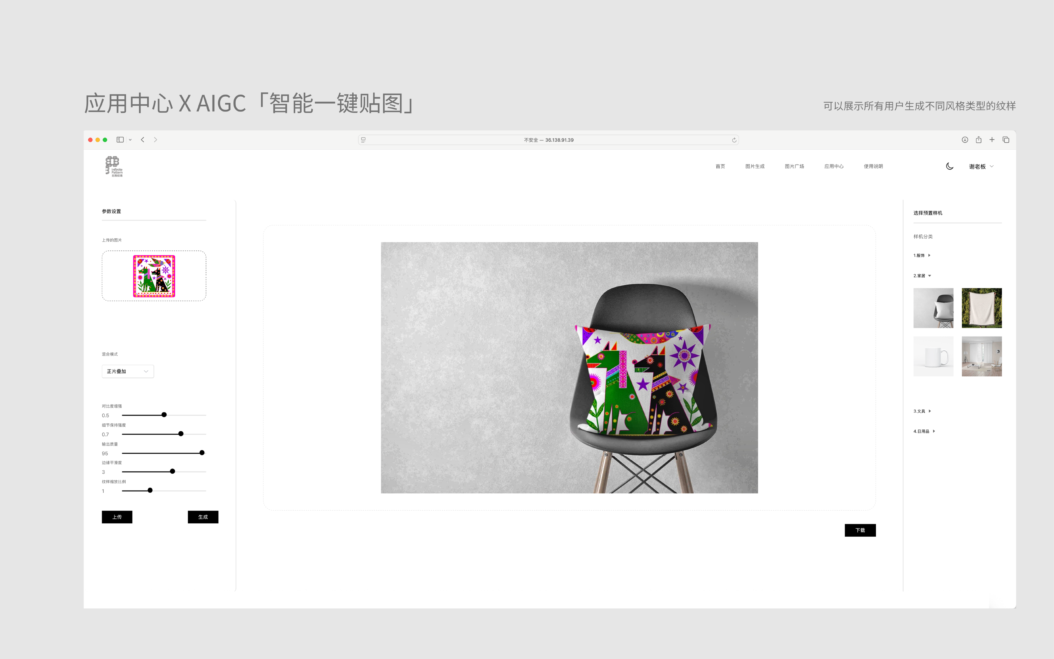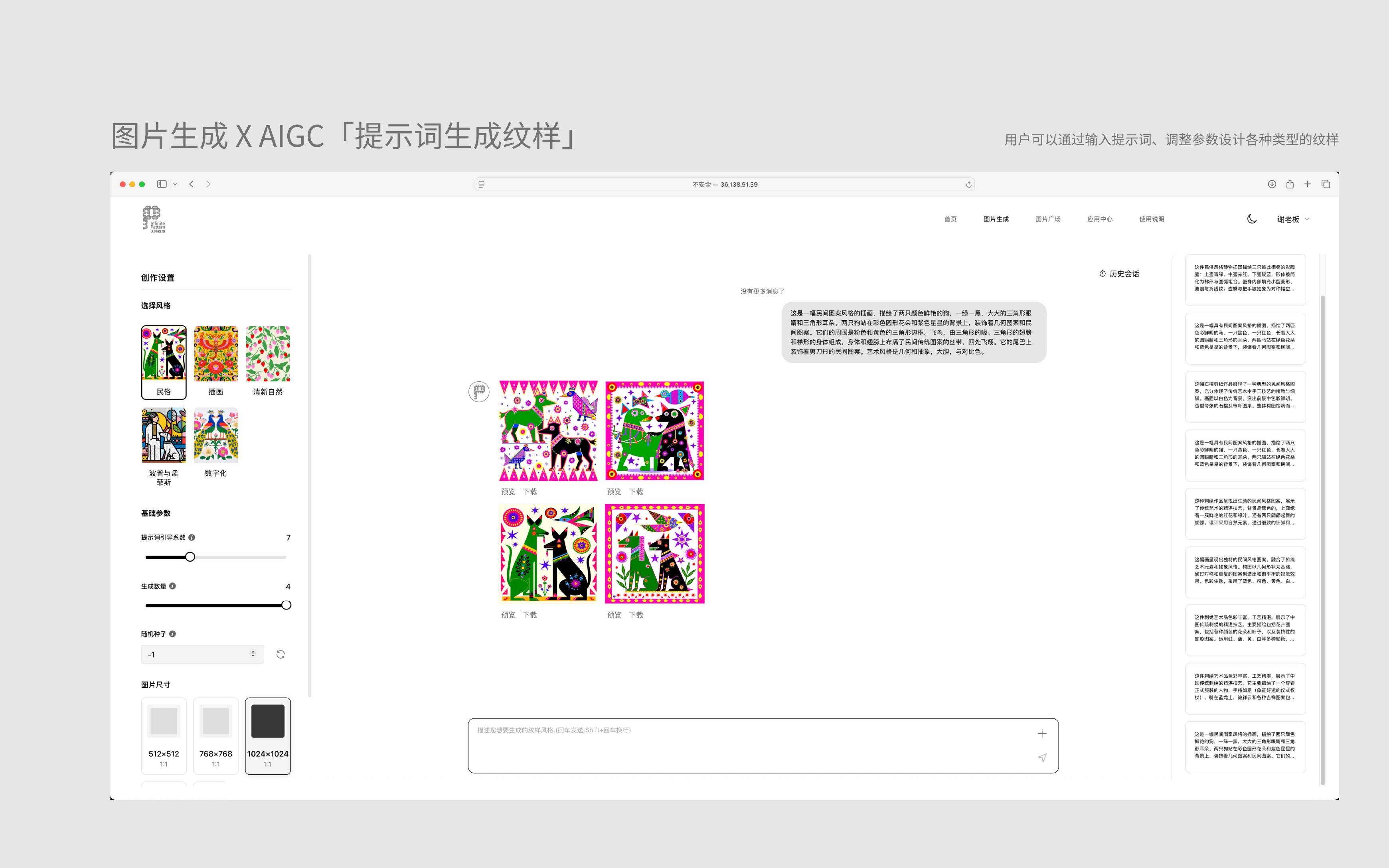 “无限纹境”是一款融合生成式人工智能与风格迁移技术的智能纹样设计平台,是“教育部人文社会科学项目”阶段性成果。平台构建从“纹样识别一纹样生成一编辑设计一应用转化”的完整工具链,集创意与应用于一体的平台,使非艺术、设计领域的用户也能实现创意生成,输出高原创性、个性化的纹样设计。平台可对接纺织、家居、文创产品等生产线,实现传统纹样活化应用,缩短设计-打样-上市周期并节省打样成本。平台开放传统纹样数据库与“文生图/图生图”低门槛界面,让大众与非设计专业群体参与纹样再创,提升文化认同和美育。