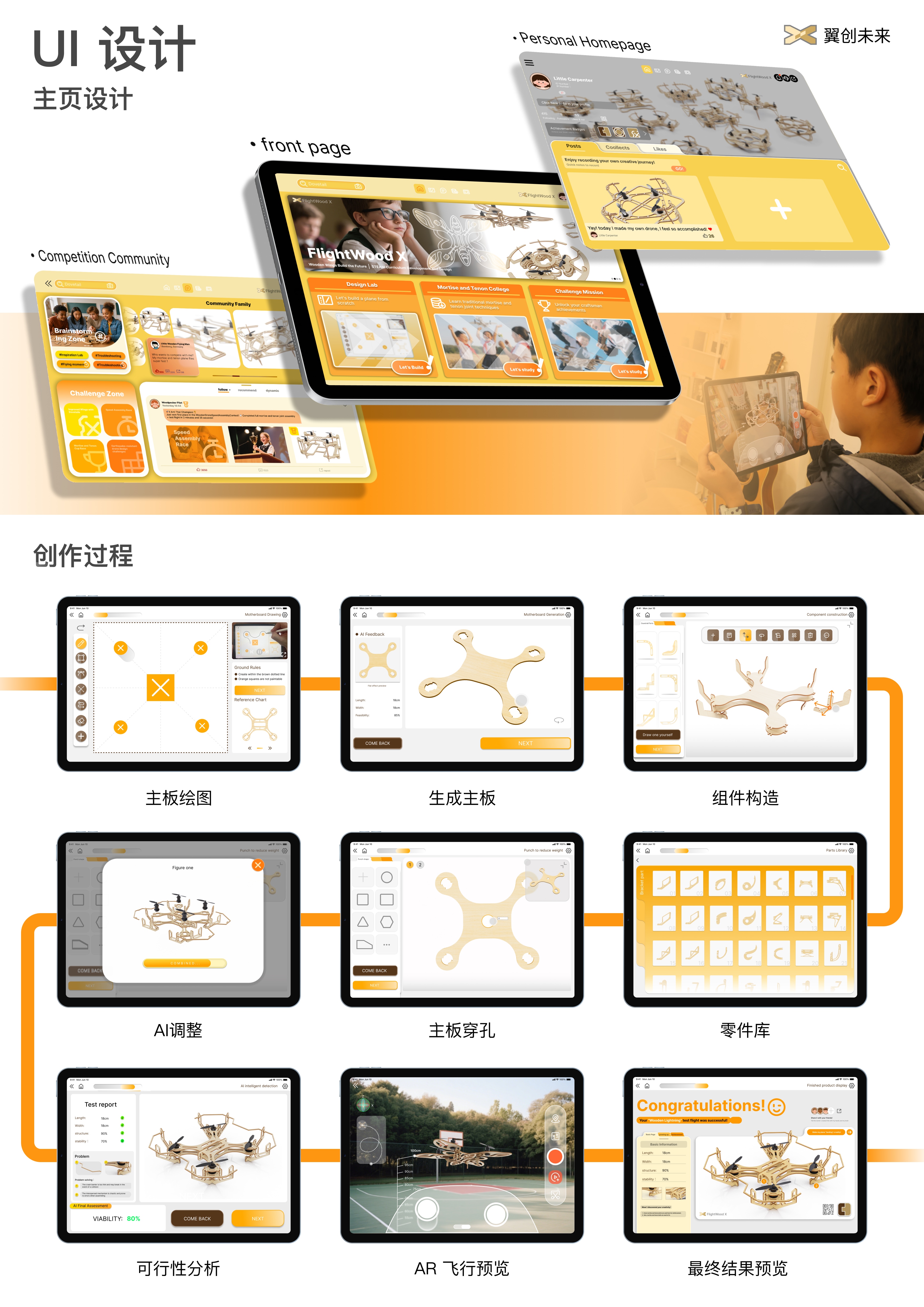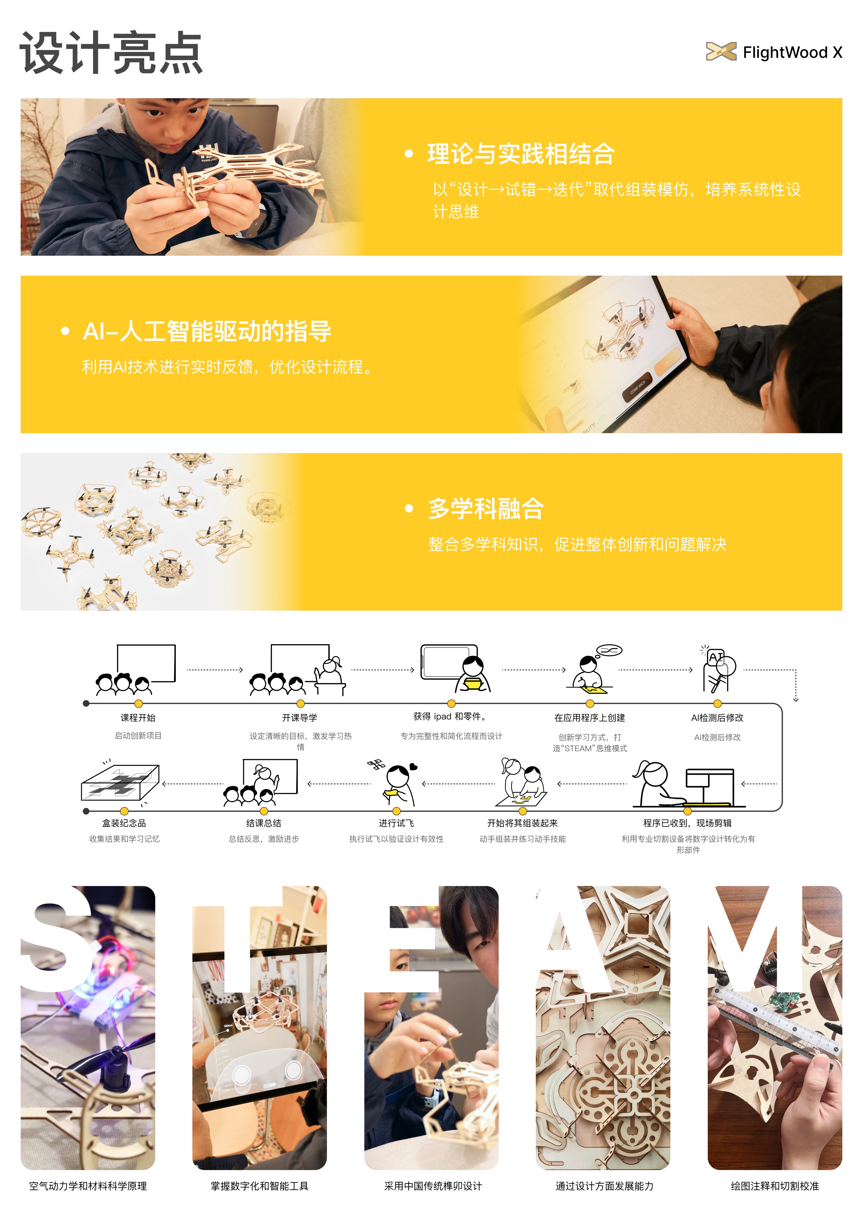Flight Wood X是一款融合榫卯工艺与数字技术的木质无人机STEAM教育系统。产品通过平板绘图、AI进行CAD建模、激光切割与手工组装,帮助学生在低成本条件下掌握工程知识与实践技能。它不仅解决了传统教具昂贵、缺乏动手性的痛点,还通过绿色木材应用传承非遗工艺,兼顾安全、环保与教育价值,展现传统与现代结合的独特创新
