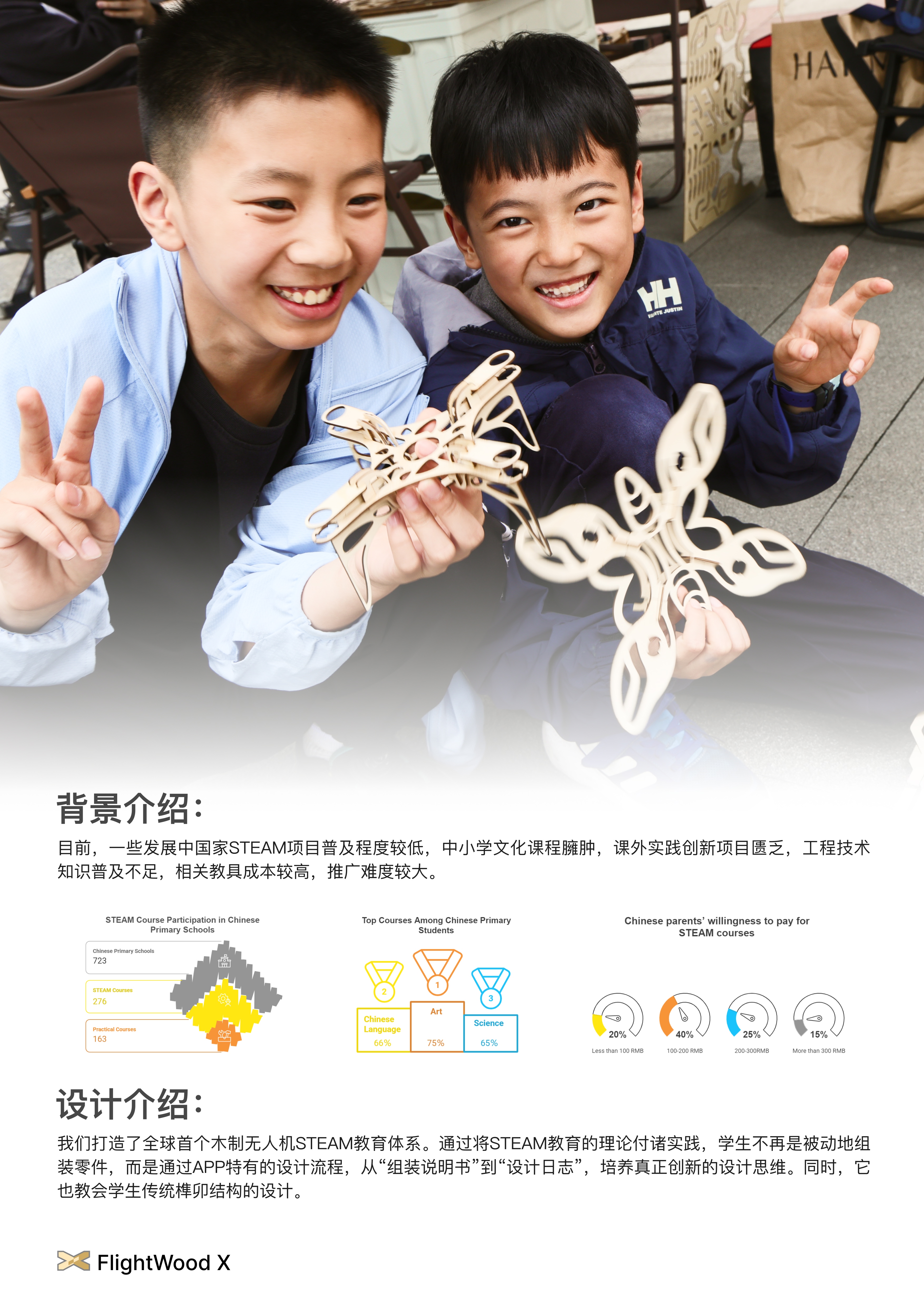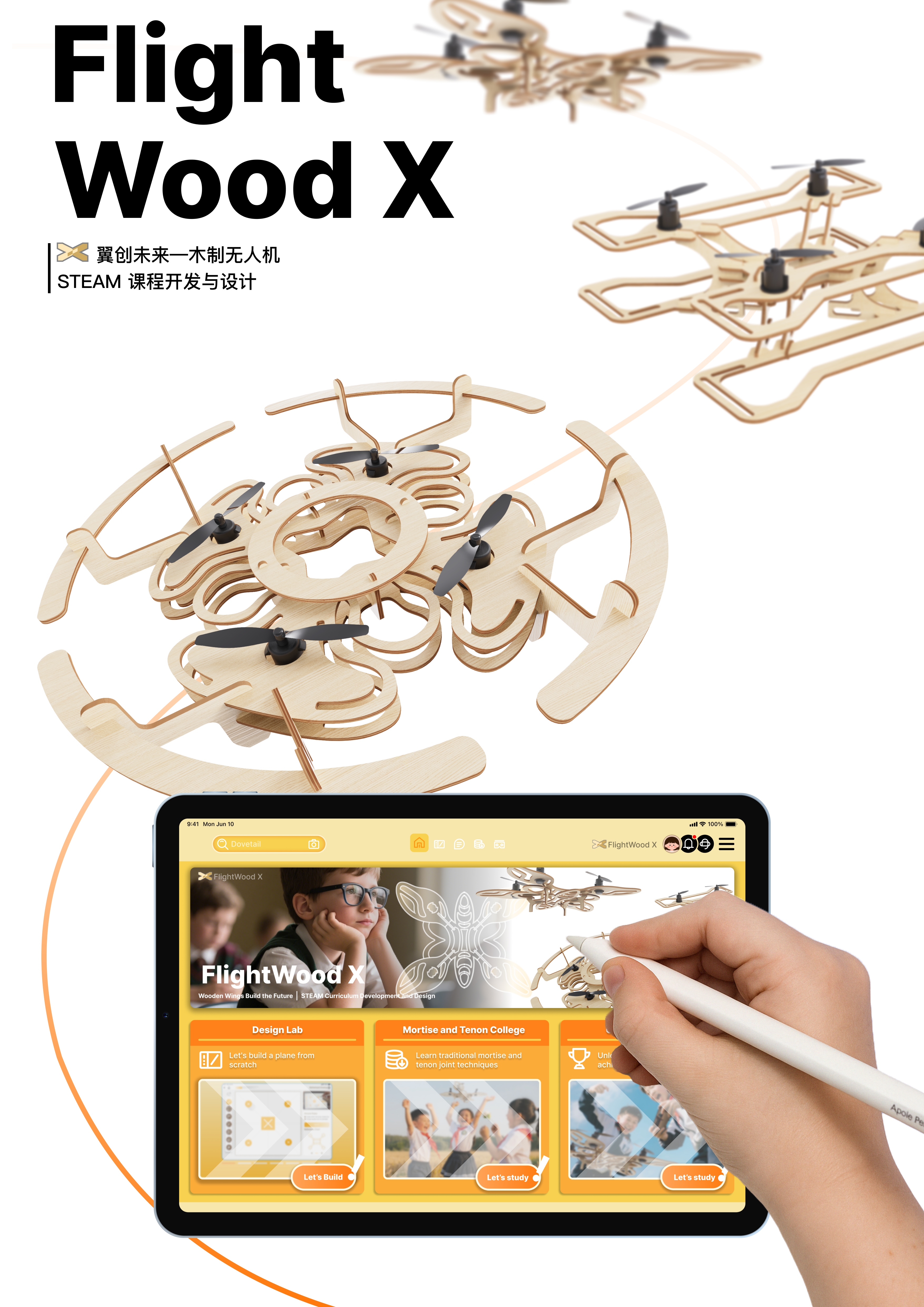 Flight Wood X is a wooden drone STEAM education system that integrates traditional mortise-and-tenon craftsmanship with digital technology. Through tablet sketching, AI-assisted CAD modeling, laser cutting, and manual assembly, the product enables students to acquire engineering knowledge and practical skills at low cost. It not only addresses the pain points of expensive traditional teaching aids and lack of hands-on experience but also preserves intangible cultural heritage through sustainable wood applications. Balancing safety, environmental responsibility, and educational value, it showcases a unique innovation that bridges tradition and modernity.