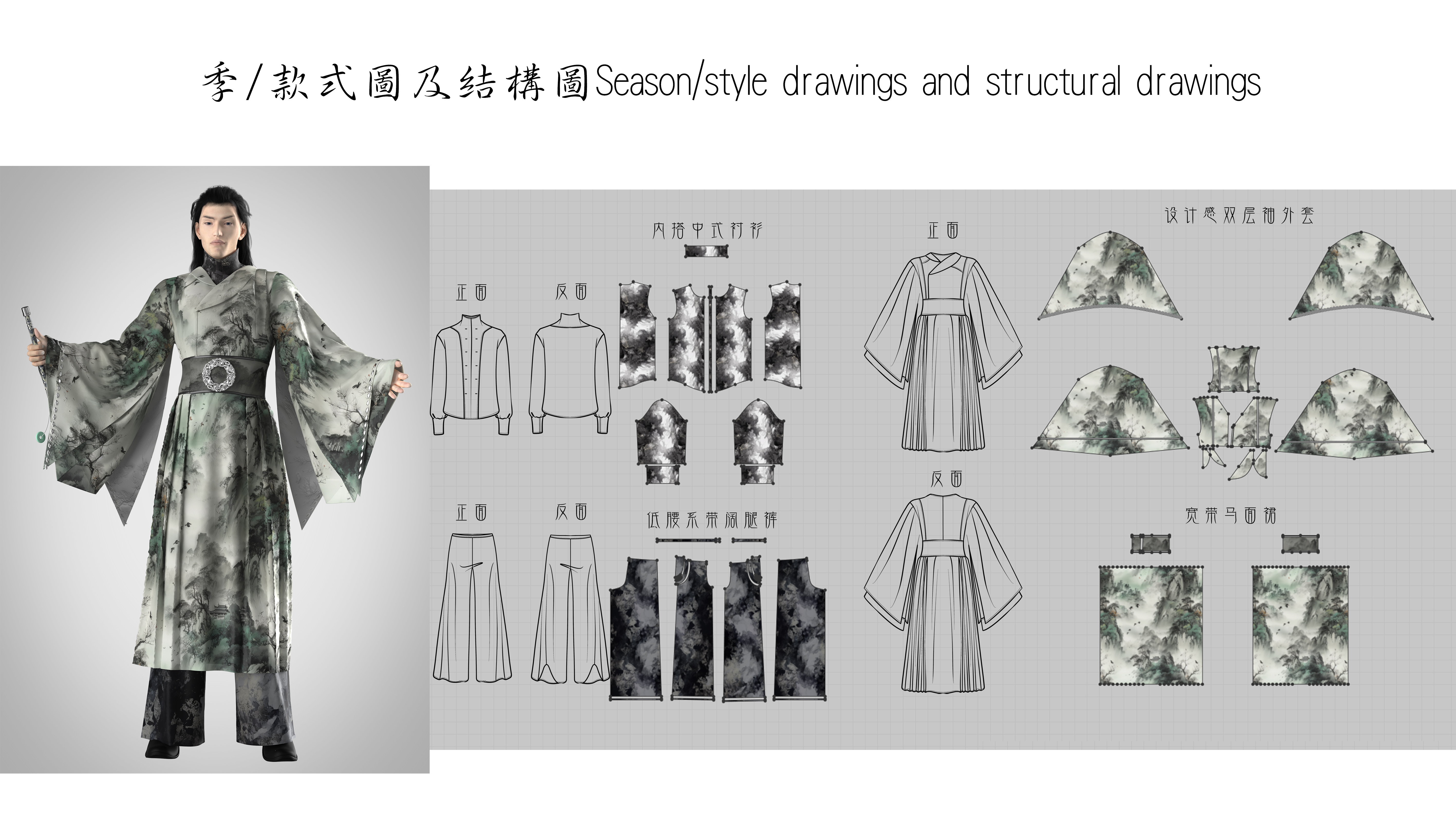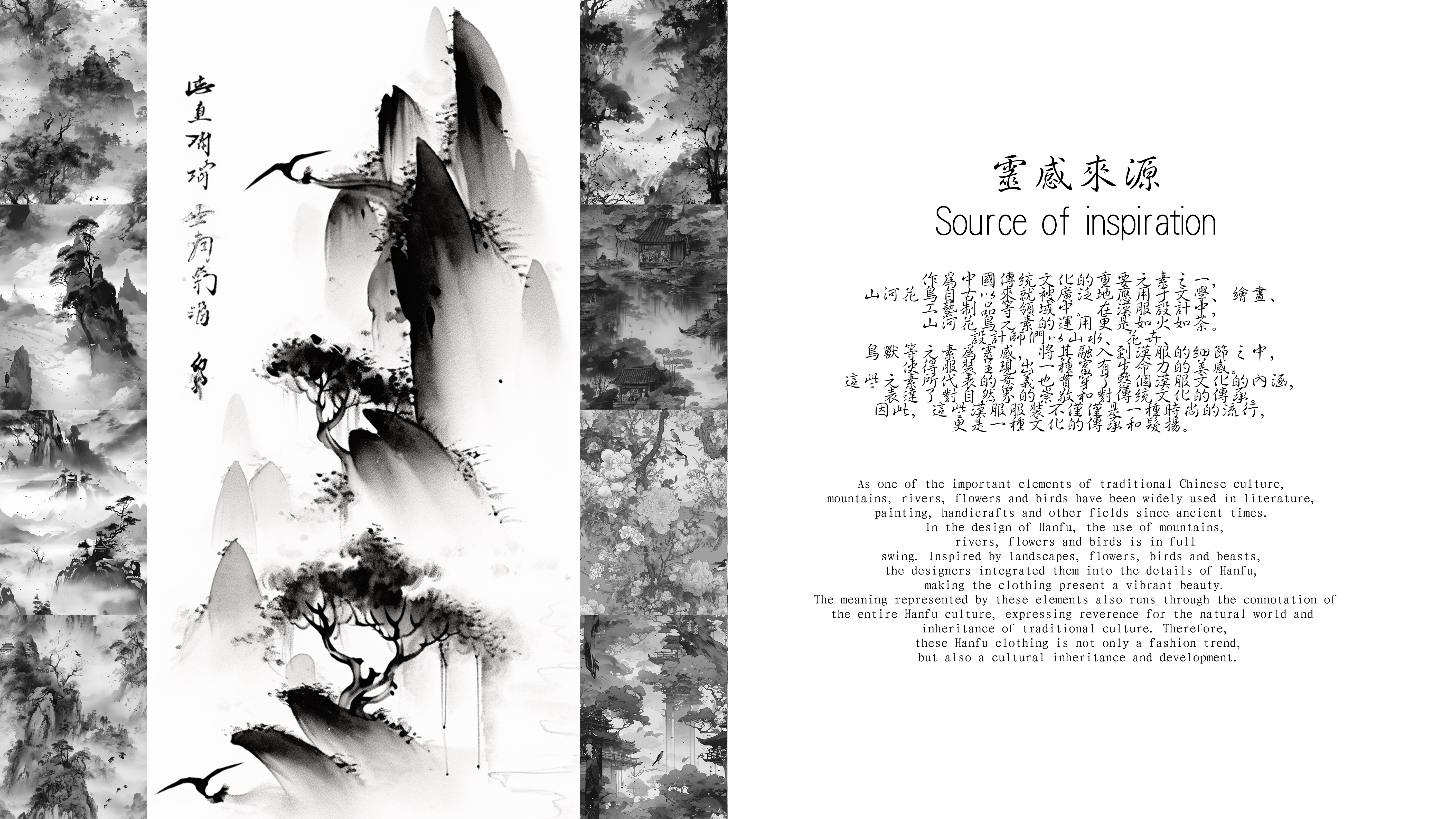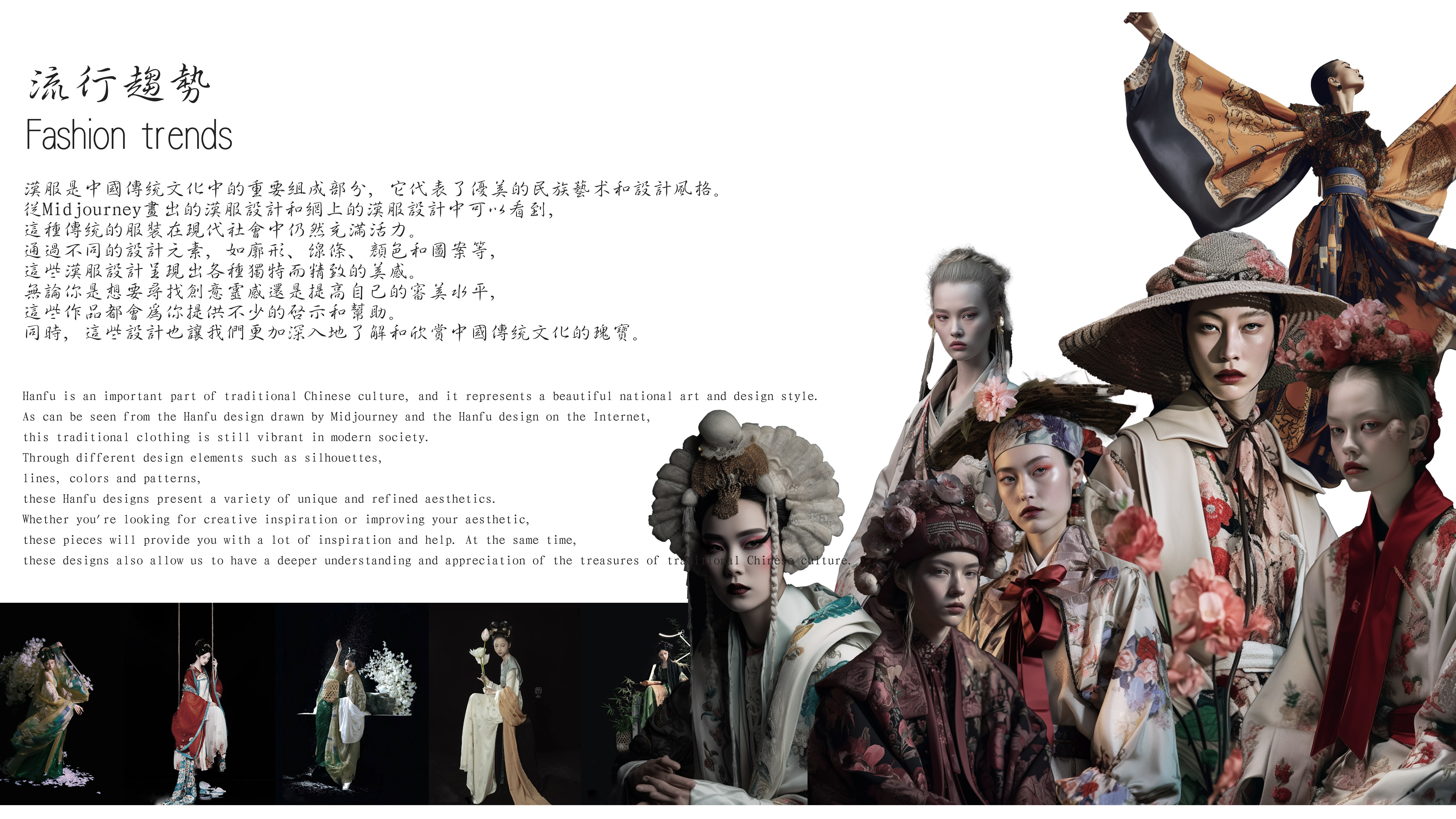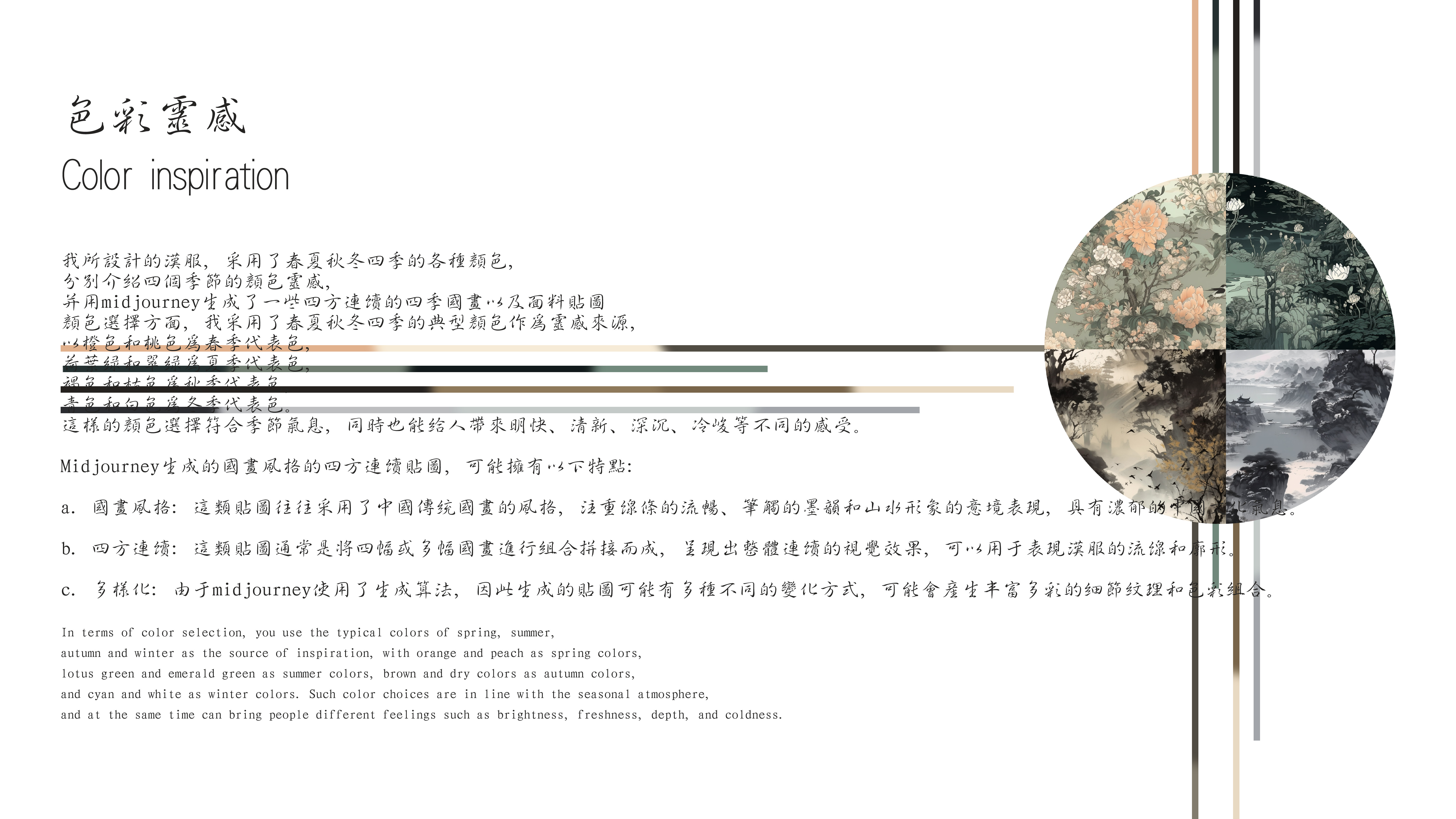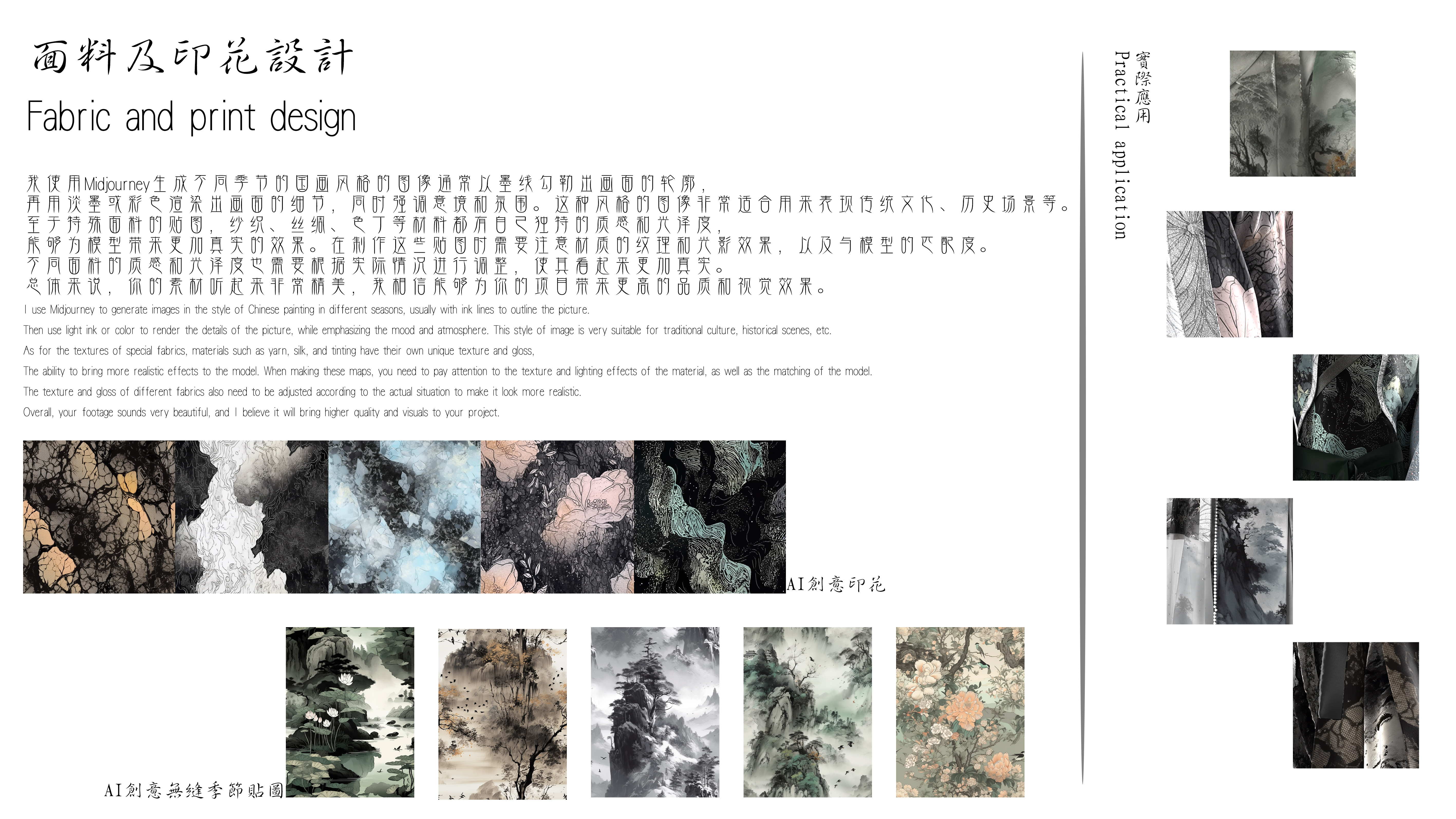 本系列以山水、花卉、鸟兽等元素为灵感,将其融入到汉服的细节之中,这些元素所代表的意义也贯穿了整个汉服文化的内涵。因此,本系列服装不仅仅是一种时尚的流行,更是一种文化的传承和发扬。 汉服是中国传统文化中的重要组成部分,它代表了优美的民族艺术和设计风格。使用Midjourney设计出的汉服可以看到,这种传统的服装在现代社会中仍然充满活力。通过不同的设计元素,如廓形、线条、颜色和图案等,这些汉服设计呈现出各种独特和精致的美感。同时,这些设计也让我们更加深入地了解和欣赏中国传统文化的瑰宝。 我使用Midjourney生成不同季节的国画风格的图像通常以墨线勾勒出国画的轮廓,再用淡墨或彩色渲染出画面的细节,同时强调意境和氛围。这种风格的图像非常适合用来表现传统文化、历史场景等。至于特殊面料的贴图、纱织、丝绸、色丁等材料都有自己独特的质感和光泽度,能够为模型带来更加真实的效果。在制作这些贴图时需要注意材质的纹理和光影效果,以及与模型的匹配度。不同面料的质感和光泽度根据实际情况进行调整,使其看起来更加真实。