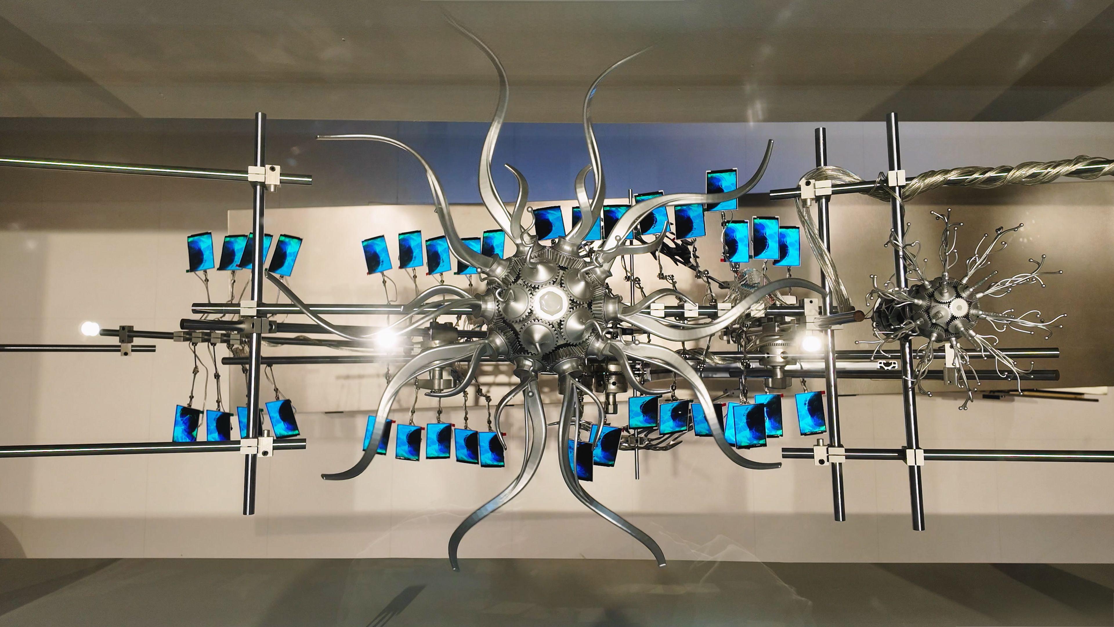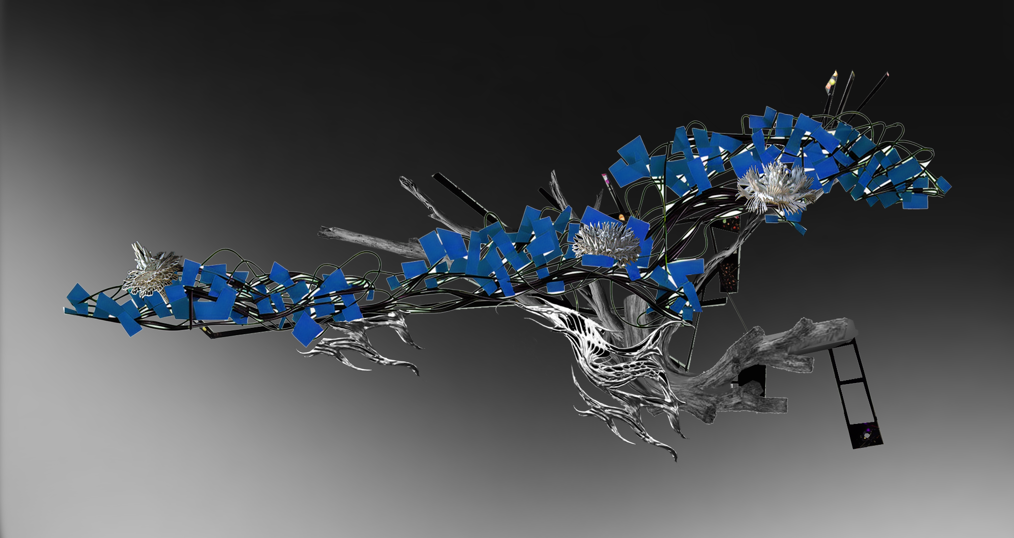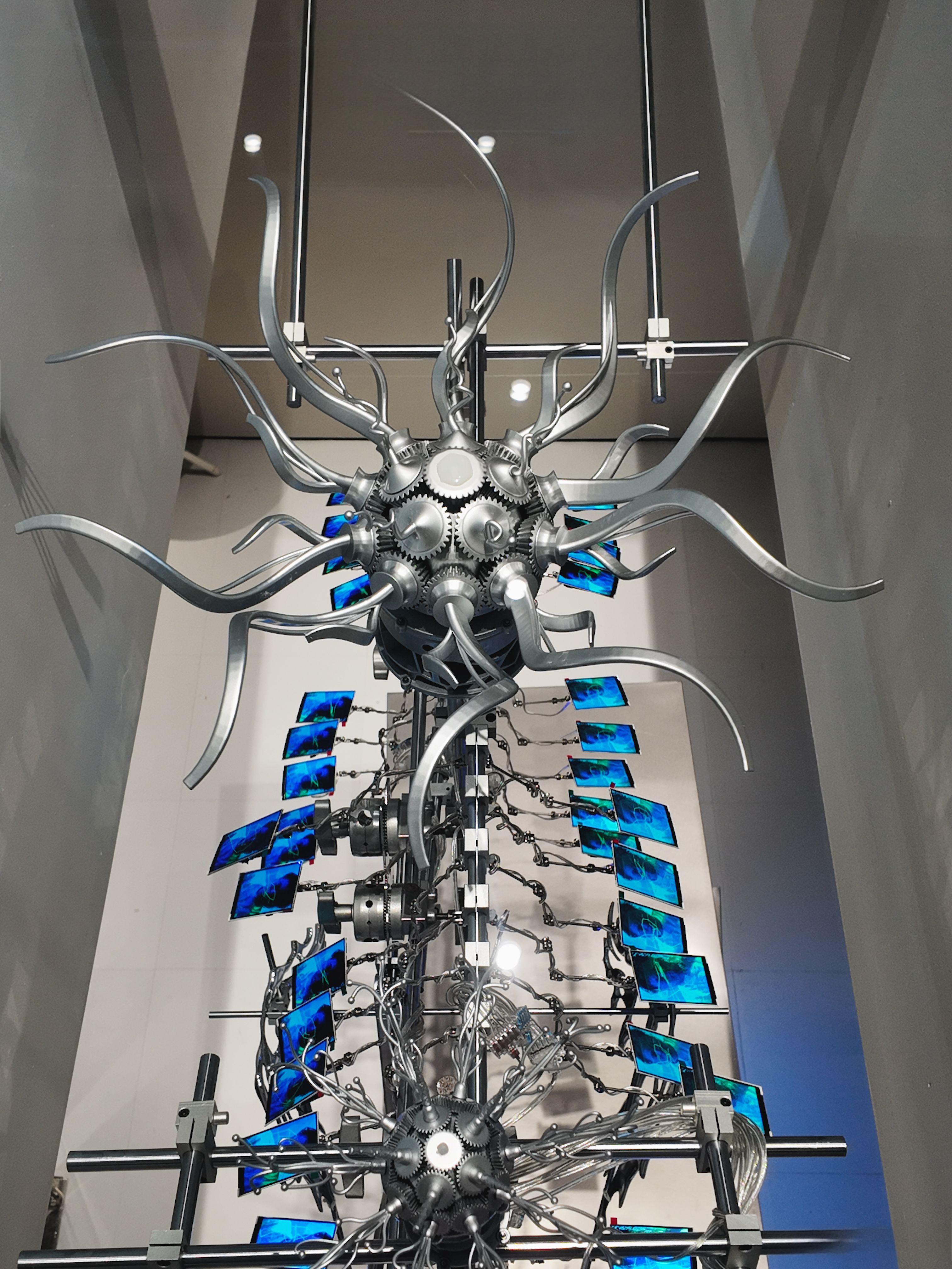 COOBBY通过仿生视角对装置进行形态设计,将自然物和科技物元素进行结合,打造出数字仿生动态装置《拟态:1》,作品模仿自然界动植物造型的机械花、模拟树枝树干形态的光轴结构和大量屏幕中对意识、时空和自然的数字化视觉模拟,无不在散发着艺术与科技的多重魅力。 在技术方面,作品基于“数字仿生”的概念原点,运用AI图像生成软件Stable Diffusion对大量动植物图像进行解构和再生成, 在三维软件中进行结构设计和组件配置,最后按照三维效果图进行装置的落地装配。 在概念方面,作品名“拟态:1”是对AI绘画程序中提示词语法权重的借鉴。在当今时代下,AI的发展影响了人类艺术创作的信心,导致部分人被它所困扰,部分人被它所捆绑;但决定AI想象力上限的依旧是人类本身,我们应该从和技术的博弈中回到想象力的原点——对万事万物保持好奇和探究。“拟态:1”便是对想象力更应该输入人脑而不是电脑这一概念的强调。