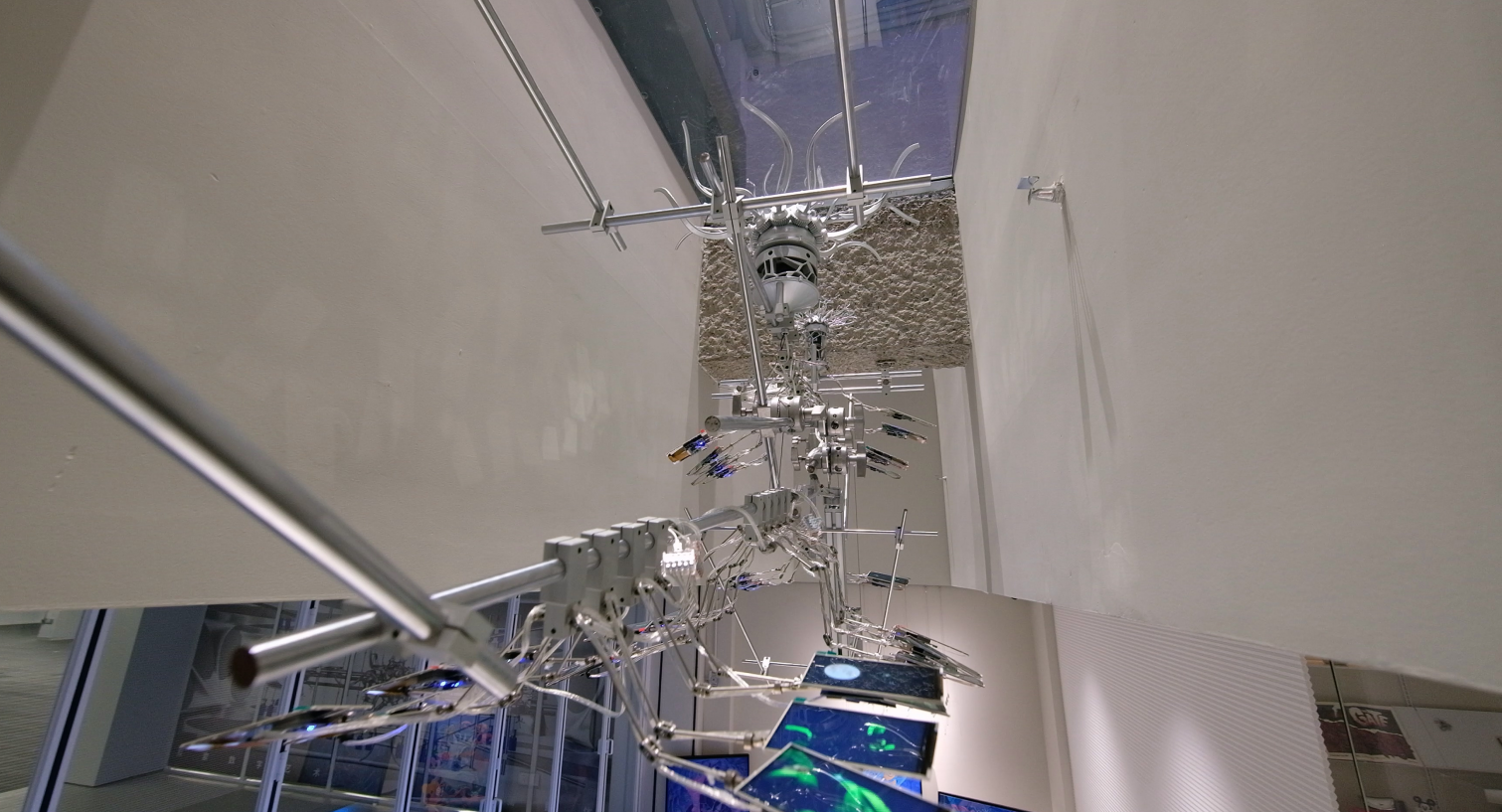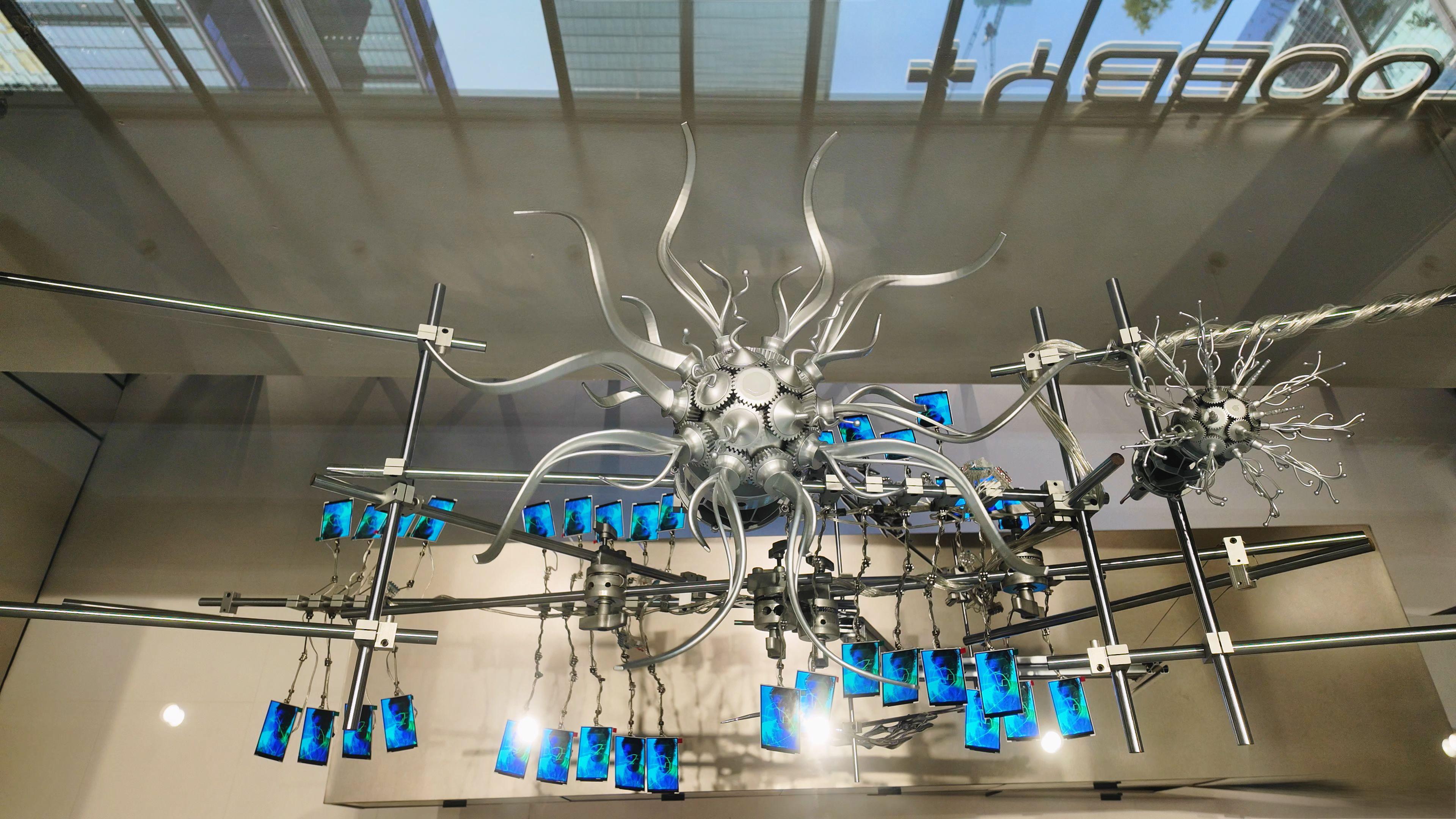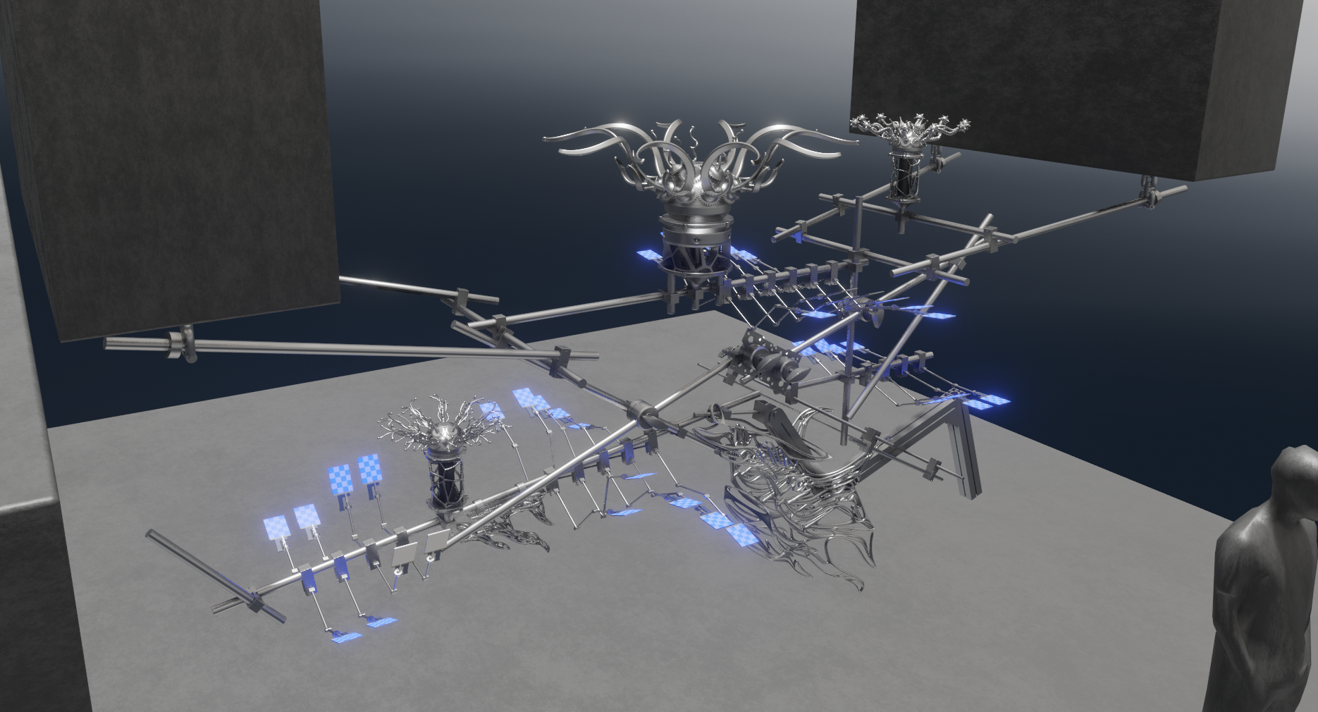 COOBBY通过仿生视角对装置进行形态设计,将自然物和科技物元素进行结合,打造出数字仿生动态装置《拟态:1》,作品模仿自然界动植物造型的机械花、模拟树枝树干形态的光轴结构和大量屏幕中对意识、时空和自然的数字化视觉模拟,无不在散发着艺术与科技的多重魅力。 在技术方面,作品基于“数字仿生”的概念原点,运用AI图像生成软件Stable Diffusion对大量动植物图像进行解构和再生成, 在三维软件中进行结构设计和组件配置,最后按照三维效果图进行装置的落地装配。 在概念方面,作品名“拟态:1”是对AI绘画程序中提示词语法权重的借鉴。在当今时代下,AI的发展影响了人类艺术创作的信心,导致部分人被它所困扰,部分人被它所捆绑;但决定AI想象力上限的依旧是人类本身,我们应该从和技术的博弈中回到想象力的原点——对万事万物保持好奇和探究。“拟态:1”便是对想象力更应该输入人脑而不是电脑这一概念的强调。