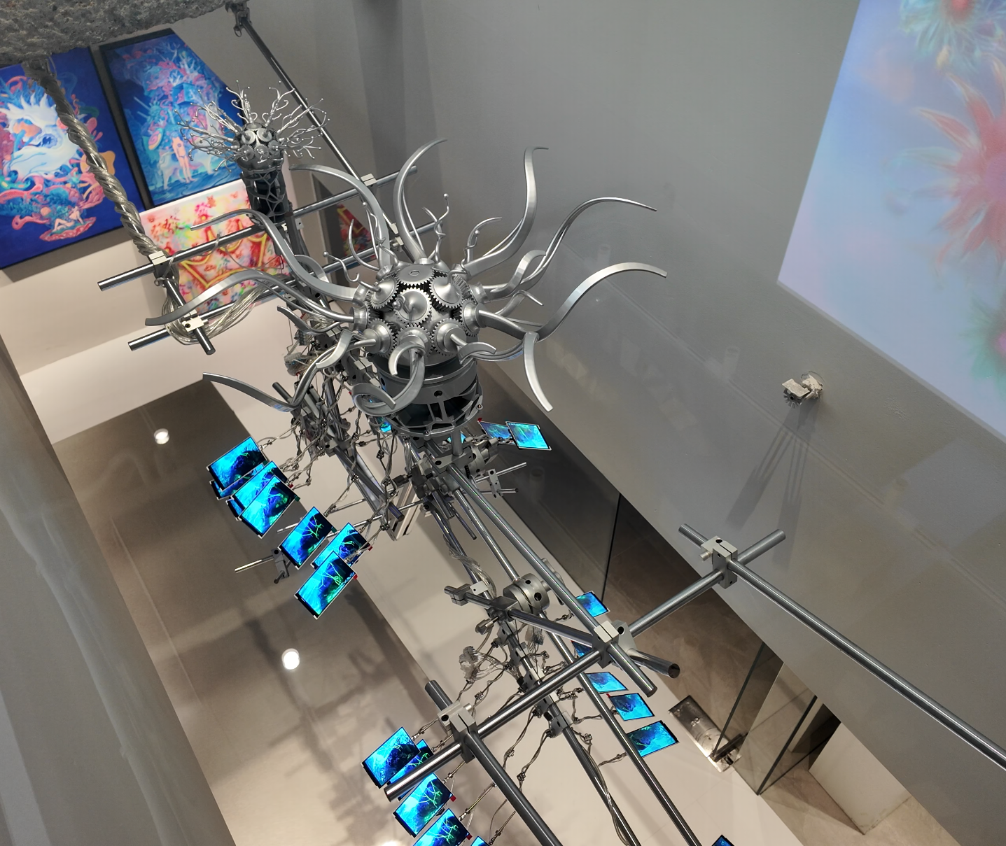 Through a biomorphic perspective, COOBBY designed the form of its installation by merging elements from nature and technology, creating the digital biomimetic kinetic installation Mimicry: 1. The work incorporates mechanical flowers that emulate the shapes of plants and animals, light-axis structures that simulate tree branches and trunks, and multiple screens that present digitalized visual simulations of consciousness, time, and nature. Together, these components radiate the multifaceted allure of art and technology. From a technical perspective, the installation is grounded in the concept of digital biomimicry. Large datasets of plant and animal images were deconstructed and regenerated using the AI image-generation software Stable Diffusion. Structural design and component configuration were carried out within 3D modeling software, followed by on-site assembly in accordance with the 3D renderings. From a conceptual perspective, the title Mimicry: 1 draws inspiration from the syntax of weighting in AI image-generation prompts. In the present era, the rapid development of AI has influenced human confidence in artistic creation: some individuals feel troubled by it, while others become dependent on it. Yet the boundaries of AI’s imaginative capacity remain defined by human beings. Rather than being constrained by competition with technology, we should return to the original source of imagination—sustaining curiosity and inquiry toward all things. Mimicry: 1 emphasizes that imagination should be nourished in the human mind rather than in machines.