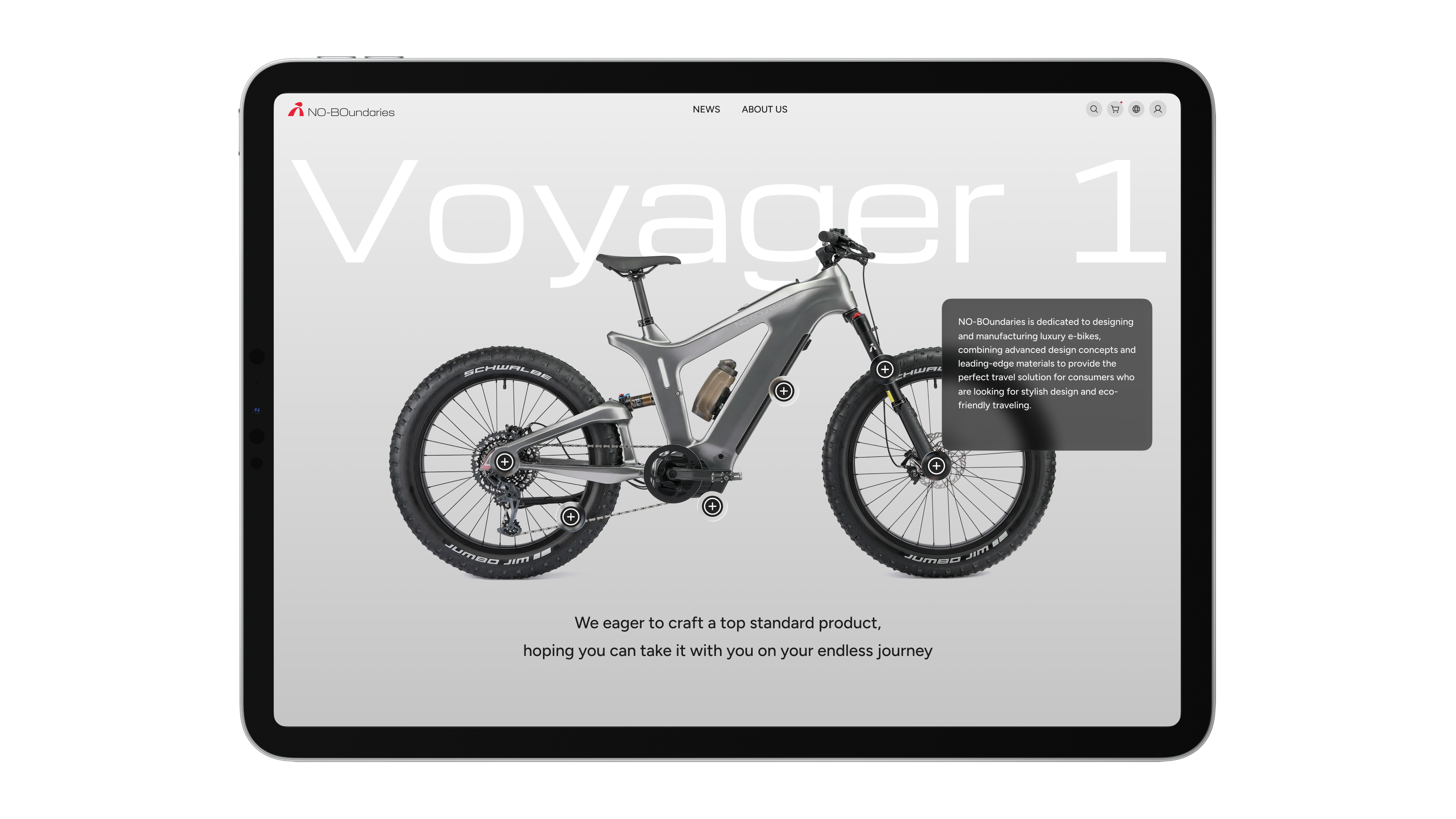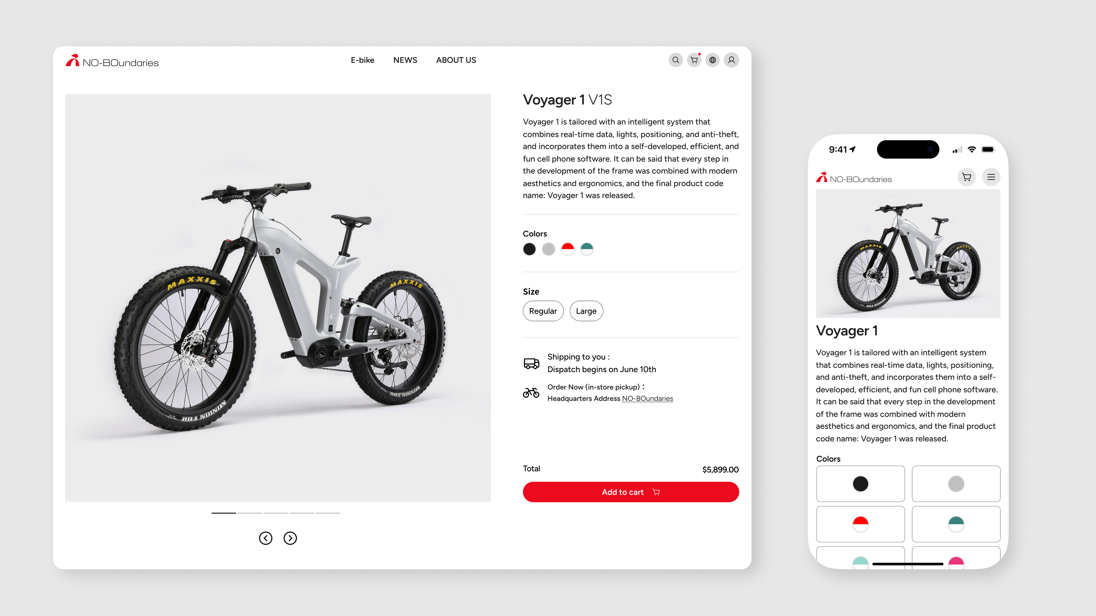 本作品为电动自行车品牌 Noboundaries 设计的官方网站 UI。以“无界·自由”为理念,整体视觉融合科技感与未来感。设计优化购物流程,支持多端体验,并设置产品对比、颜色定制与场景模拟,提升互动性。通过融入用户故事与骑行内容,网站不仅展示产品,更传递品牌探索精神与绿色出行价值。
