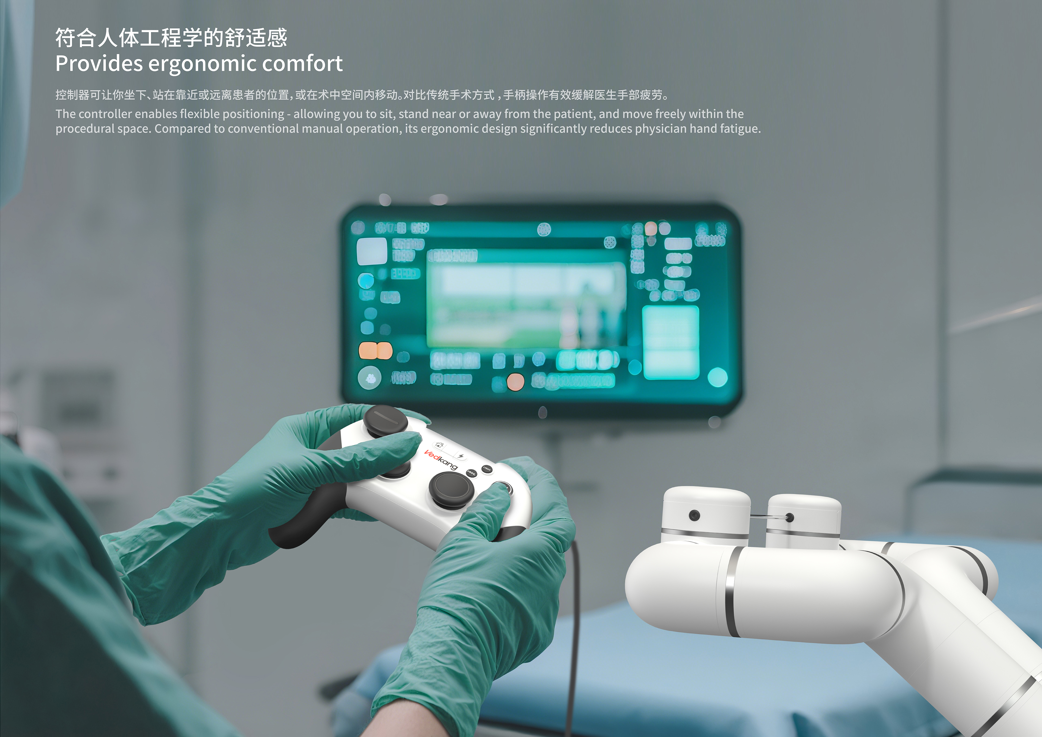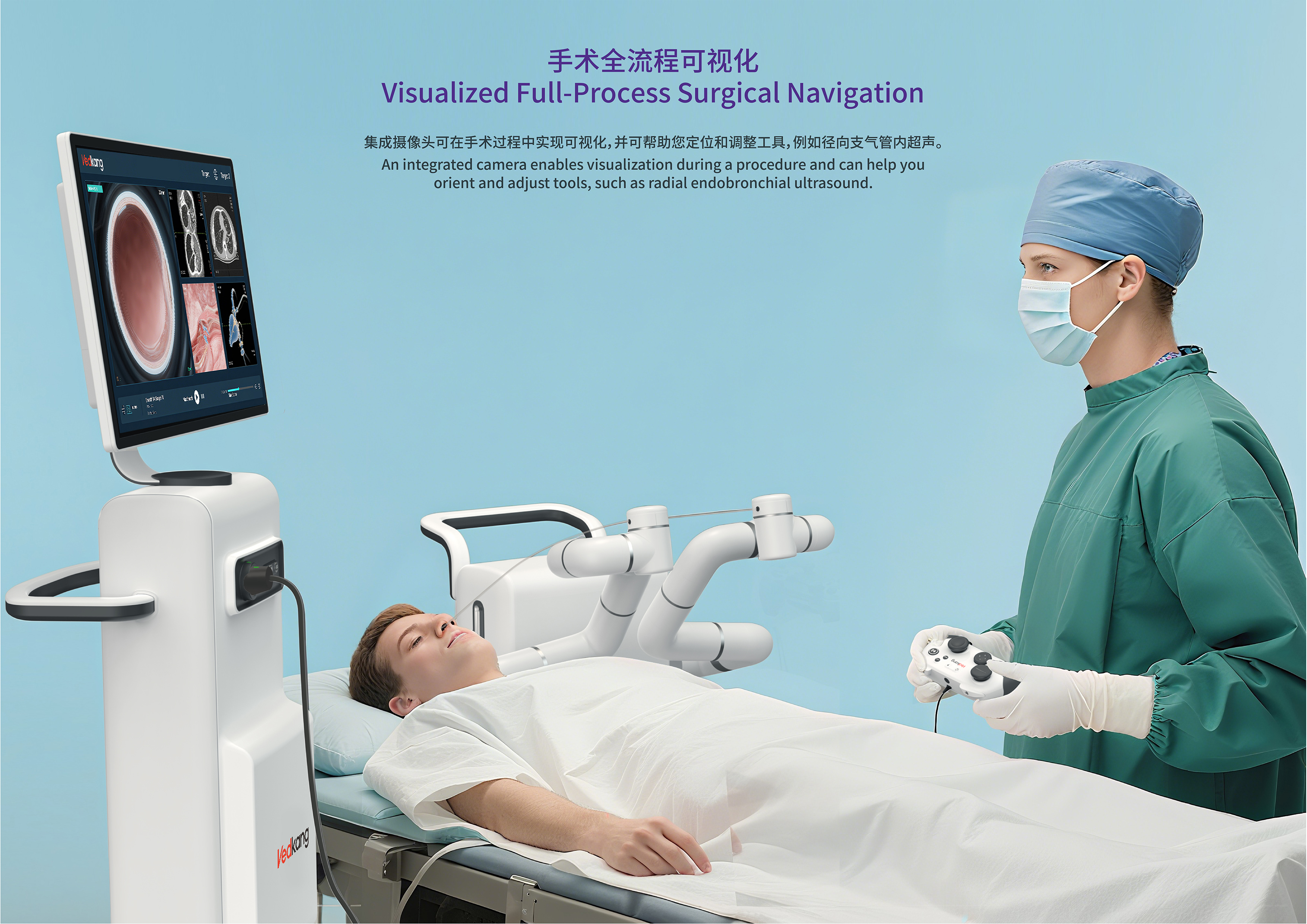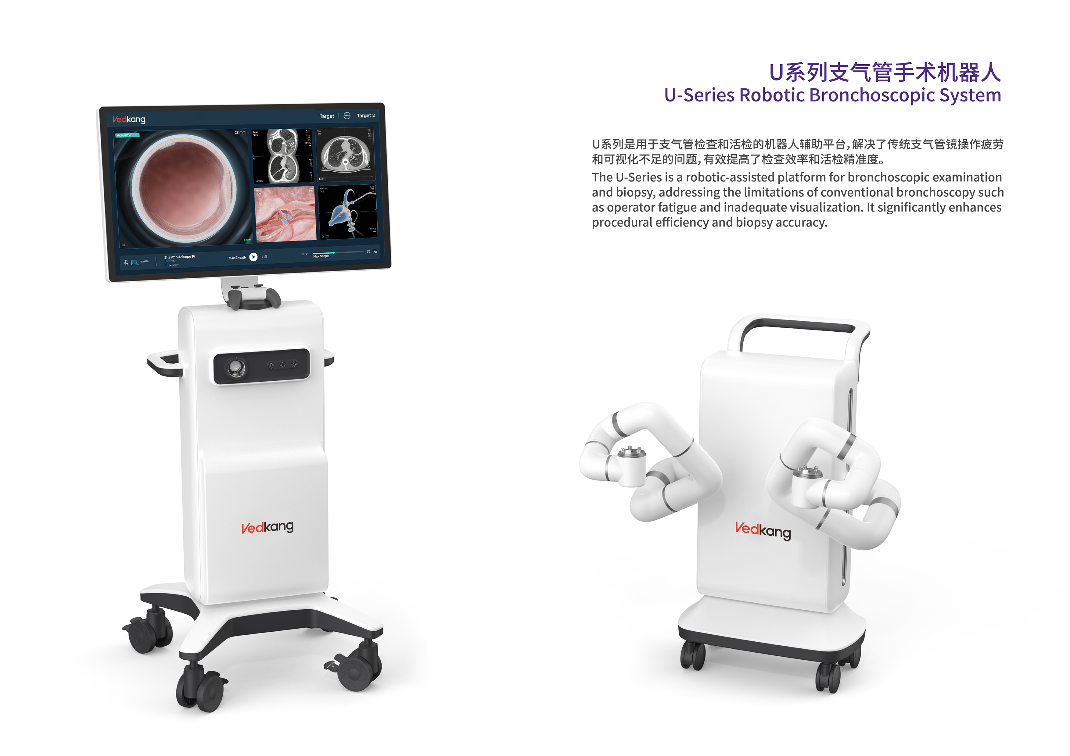 The U-Series is a robotic bronchoscopy system that enables precise visualization for pulmonary nodule examination. Its intelligent controller reduces operator fatigue while improving biopsy efficiency and accuracy. The U series bronchoscopic surgical robot has three major design innovations: 1) The first independently articulated telescopic endoscope system, which breaks through the limitations of traditional bronchoscope operation through force redirection technology and accurately reaches 48% of peripheral pulmonary nodules; 2) Innovative integrated multimodal visualization system, combined with high-definition camera and ultrasound guidance, to achieve real-time and accurate navigation throughout the operation; 3) Revolutionary human-computer interaction design, using intelligent force feedback handle and multi-degree-of-freedom controller, supports a variety of operating positions, and reduces operating fatigue by 60% compared with traditional methods. These innovations systematically solve the three major clinical pain points of "out of reach, unclear vision, and tiring operation" in the diagnosis and treatment of pulmonary nodules, increase the accuracy of biopsy to more than 95%, and create a new standard for precise interventional diagnosis and treatment.