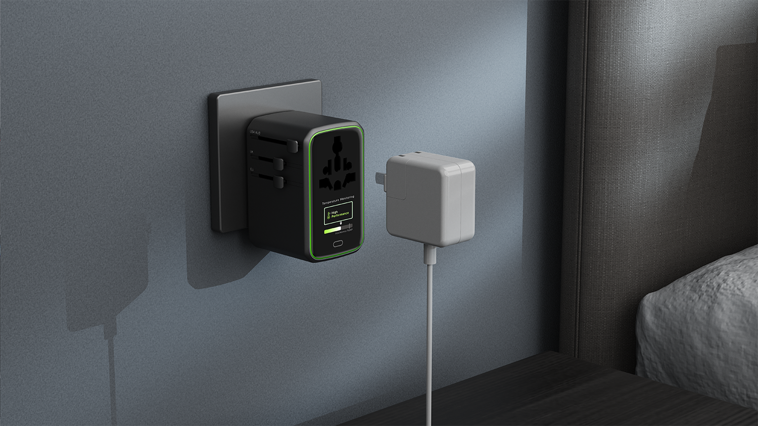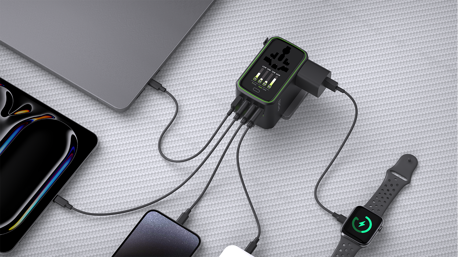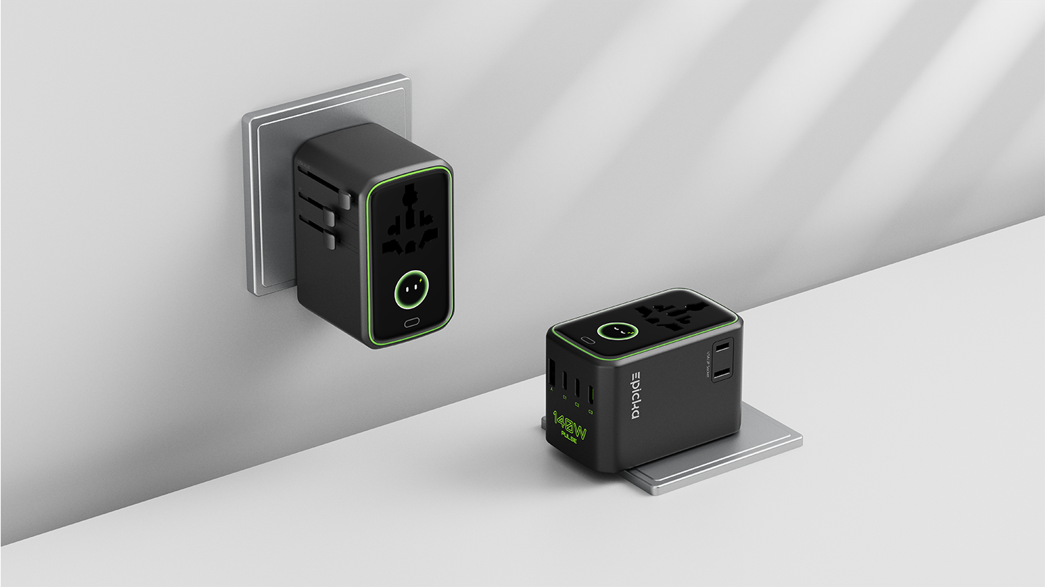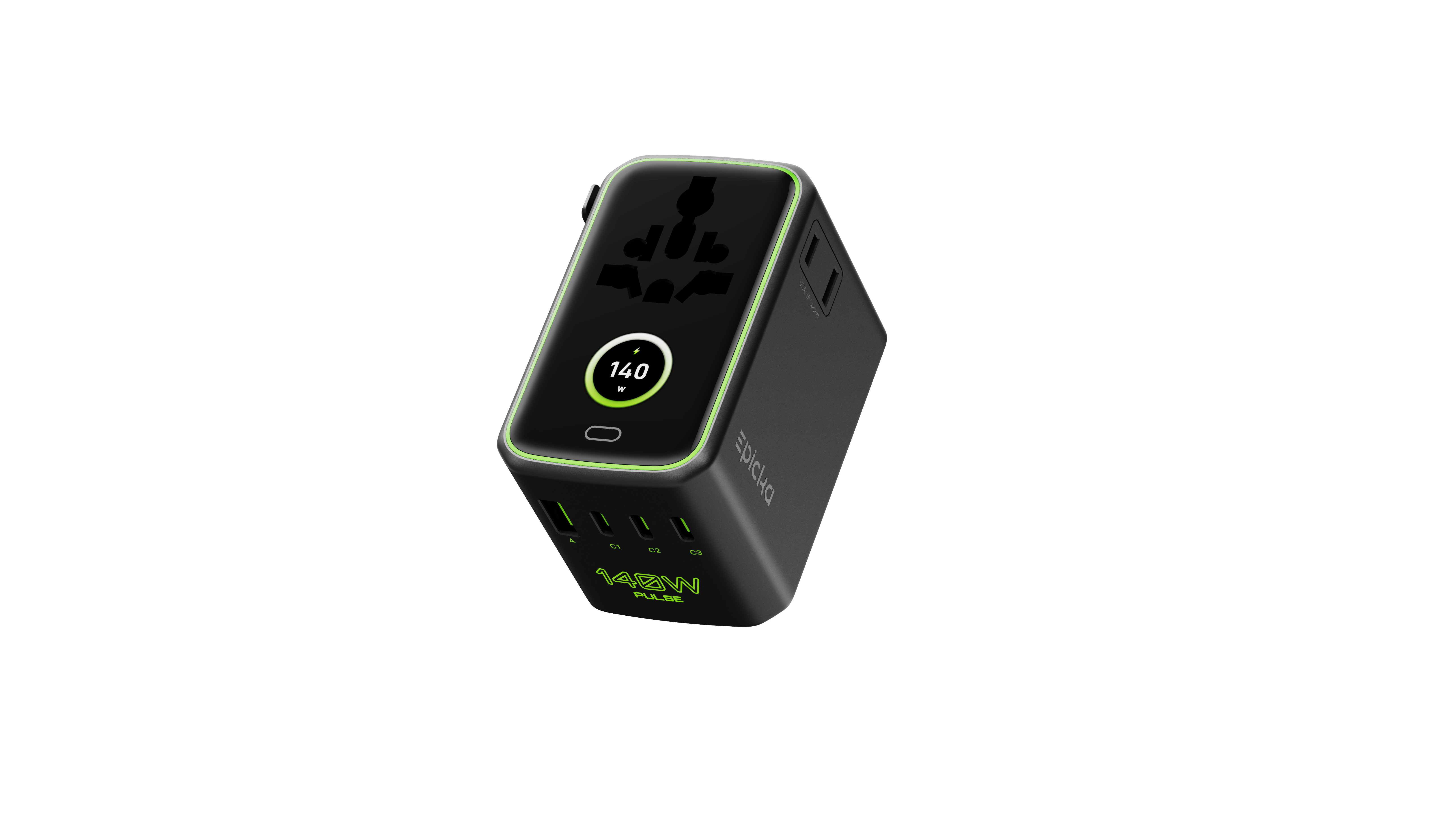 EPICKA Pulse 140W 智能屏显通用旅行转换插头旨在为全球旅行者提供便捷、安全和高效的电源连接解决方案。通过紧凑便携设计与多功能集成,我们希望商务旅行和休闲旅行人士能够在全球各地轻松使用电子设备,享受无缝的电力供应。产品具有以下三大核心特点:1. 兼容性—适配全球200多个国家和地区的电源插座,用户只需一个插头,即可在多个国家自由转换,减少携带多个转换插头的麻烦。伸缩插脚:每种插头类型都具有可伸缩插脚,可以轻松缩回和伸出,方便旅行收纳。2.集成USB充电&智能屏幕显示—配备2个AC和4个USB快充接口让用户能够同时为6个家电、数码设备快速充电,满足现代电子产品的需求。TFT 彩色智能屏幕可动态显示输出功率、使用时间、过载保护提醒,以及可爱的交互表情,解决用户的使用焦虑问题。新一代 GaN 技术可确保为旅行者的设备以140W的功率快速充电,只需 1 小时 15 分钟即可将 MacBook Pro 充满至 100%。3.设计简洁时尚,简约大气的黑色弧面屏幕,镶嵌于棱角分明的八边形轮廓中,形成强烈的几何元素冲击视觉,符合现代美学。