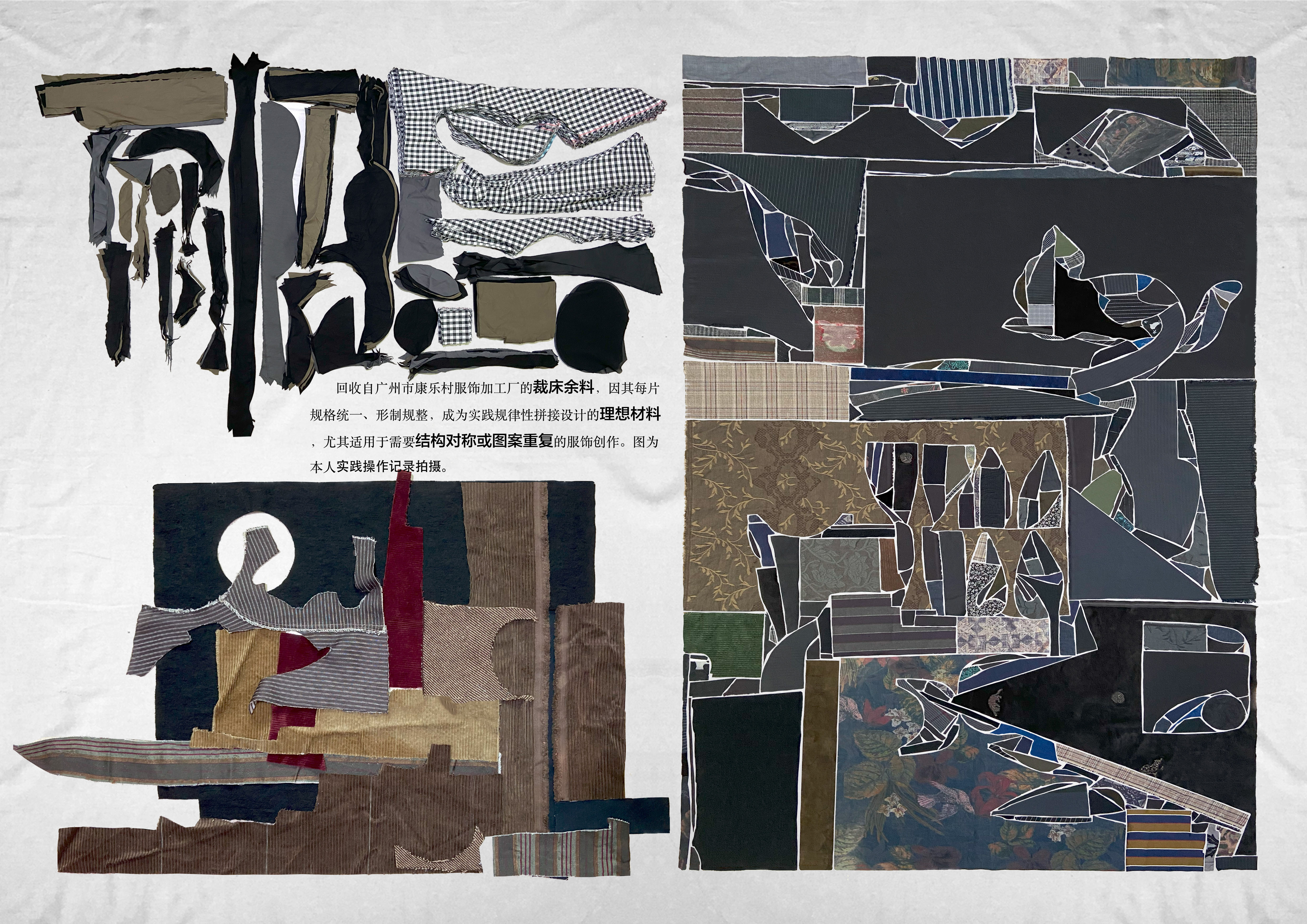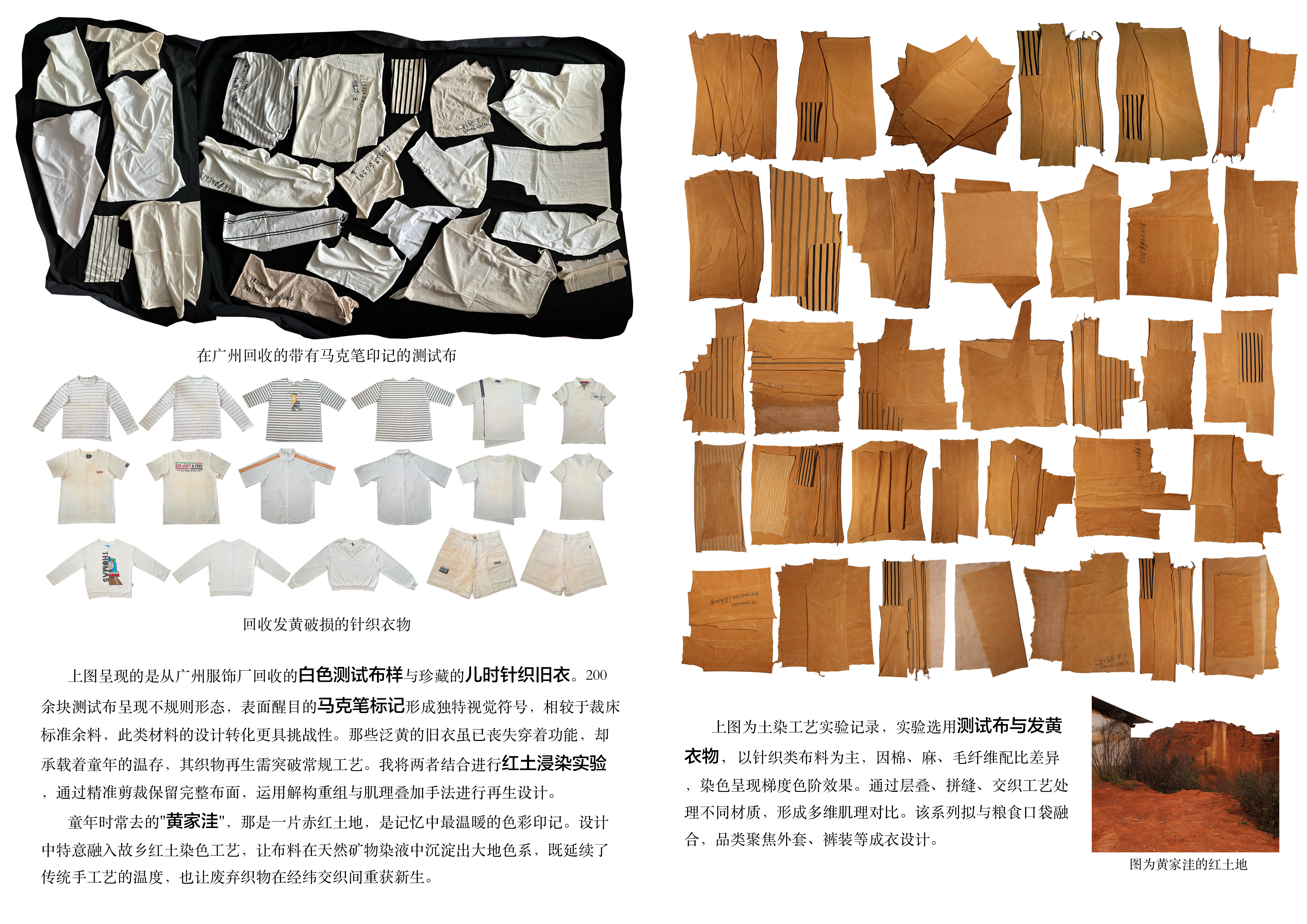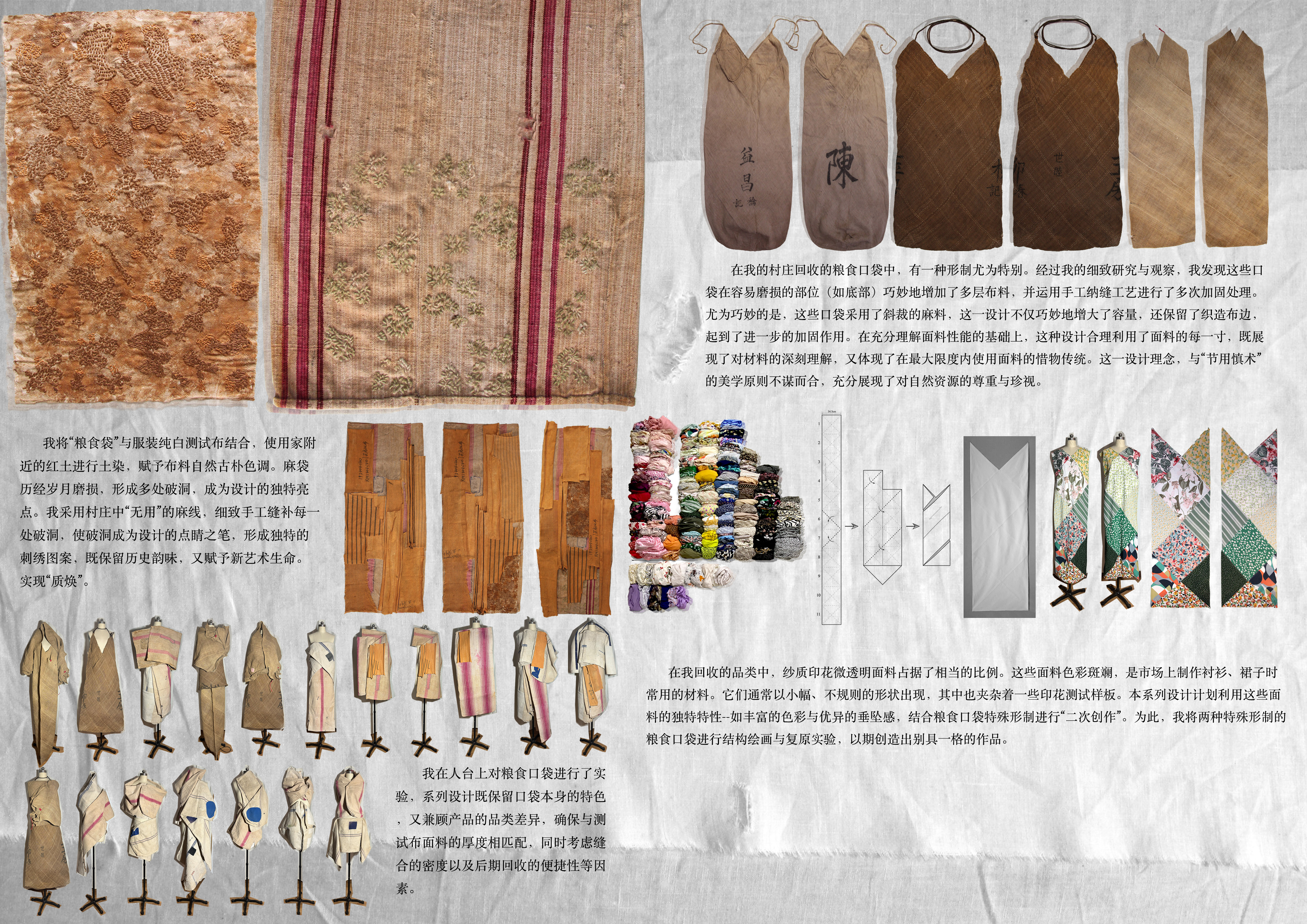 系列设计《一个村庄里的中国》以村庄故土与儿时记忆为灵感来源,将平原上那座聚居着80多户人家的质朴村落,凝练为承载集体乡愁的文化符号。当炊烟、平房与槐荫在记忆显影,那些浸润着体温的“旧物”便成了疗愈心灵的良药——粗陶碗里的温度凝结着先民的生存智慧,小巷间的烟火是平凡生活的史诗,我的“栖身港湾”也是我永不枯竭灵感源泉。 《一个村庄里的中国》系列女装设计,其核心材质的90%源自三大渠道。其一回收广州及周边地区服装公司、工厂以及面料回收站所产生的废弃物,包括测试面料、样板色卡、裁剪余料以及瑕疵面料。其二部分材质源于我在日常生活中回收的无用物品。其三,还有一部分则取材于村庄里被视作“无用”而被丢弃的老物件。这些材料虽看似已被遗弃,隐匿于世间的角落,但实际上蕴含着独特的价值。我通过回收、消毒、整理与分类,运用再生设计理念,深入挖掘它们潜在的魅力。