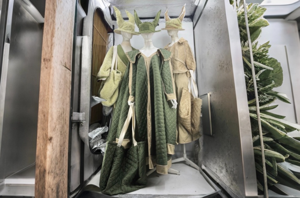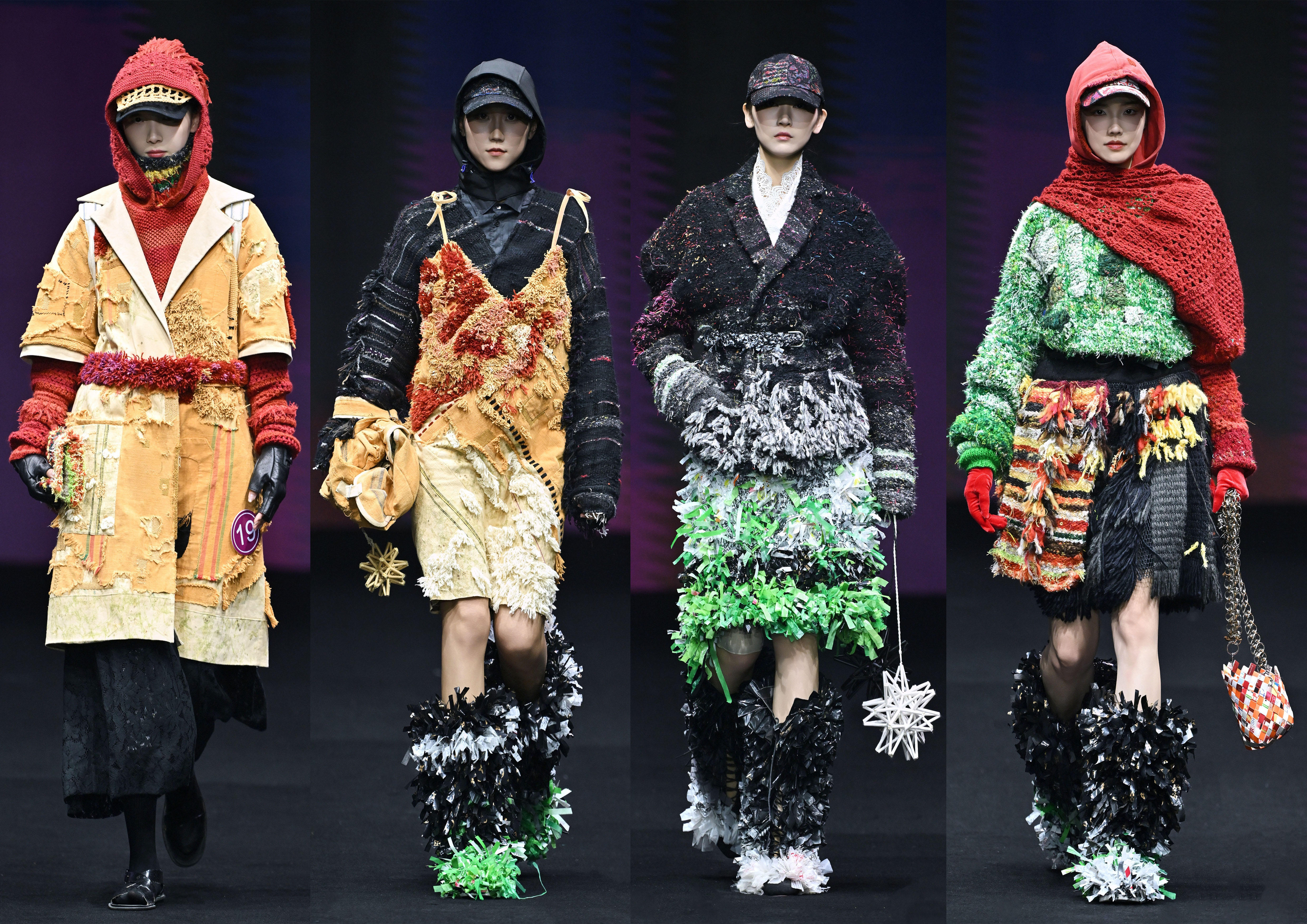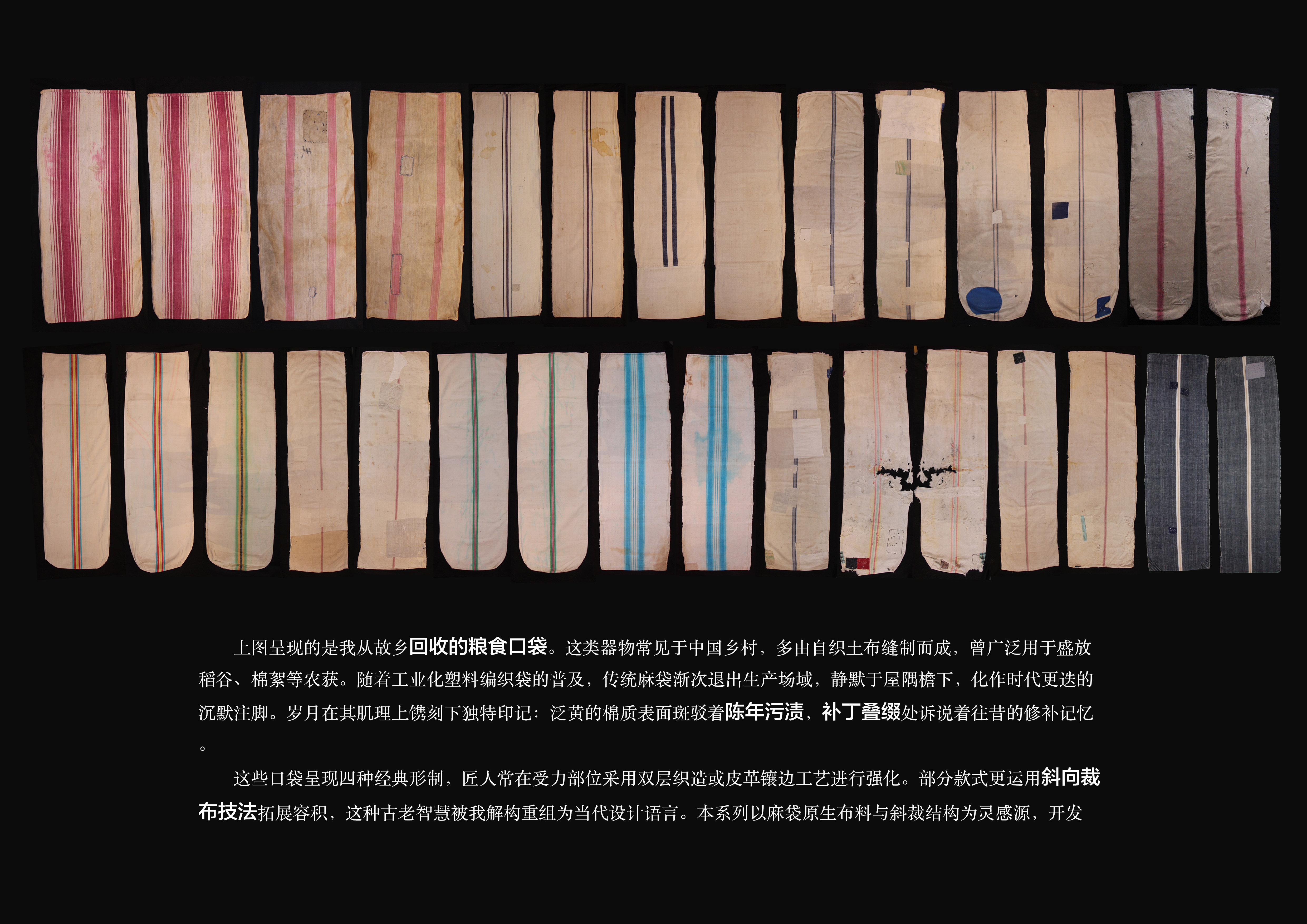 系列设计《一个村庄里的中国》以村庄故土与儿时记忆为灵感来源,将平原上那座聚居着80多户人家的质朴村落,凝练为承载集体乡愁的文化符号。当炊烟、平房与槐荫在记忆显影,那些浸润着体温的“旧物”便成了疗愈心灵的良药——粗陶碗里的温度凝结着先民的生存智慧,小巷间的烟火是平凡生活的史诗,我的“栖身港湾”也是我永不枯竭灵感源泉。 《一个村庄里的中国》系列女装设计,其核心材质的90%源自三大渠道。其一回收广州及周边地区服装公司、工厂以及面料回收站所产生的废弃物,包括测试面料、样板色卡、裁剪余料以及瑕疵面料。其二部分材质源于我在日常生活中回收的无用物品。其三,还有一部分则取材于村庄里被视作“无用”而被丢弃的老物件。这些材料虽看似已被遗弃,隐匿于世间的角落,但实际上蕴含着独特的价值。我通过回收、消毒、整理与分类,运用再生设计理念,深入挖掘它们潜在的魅力。