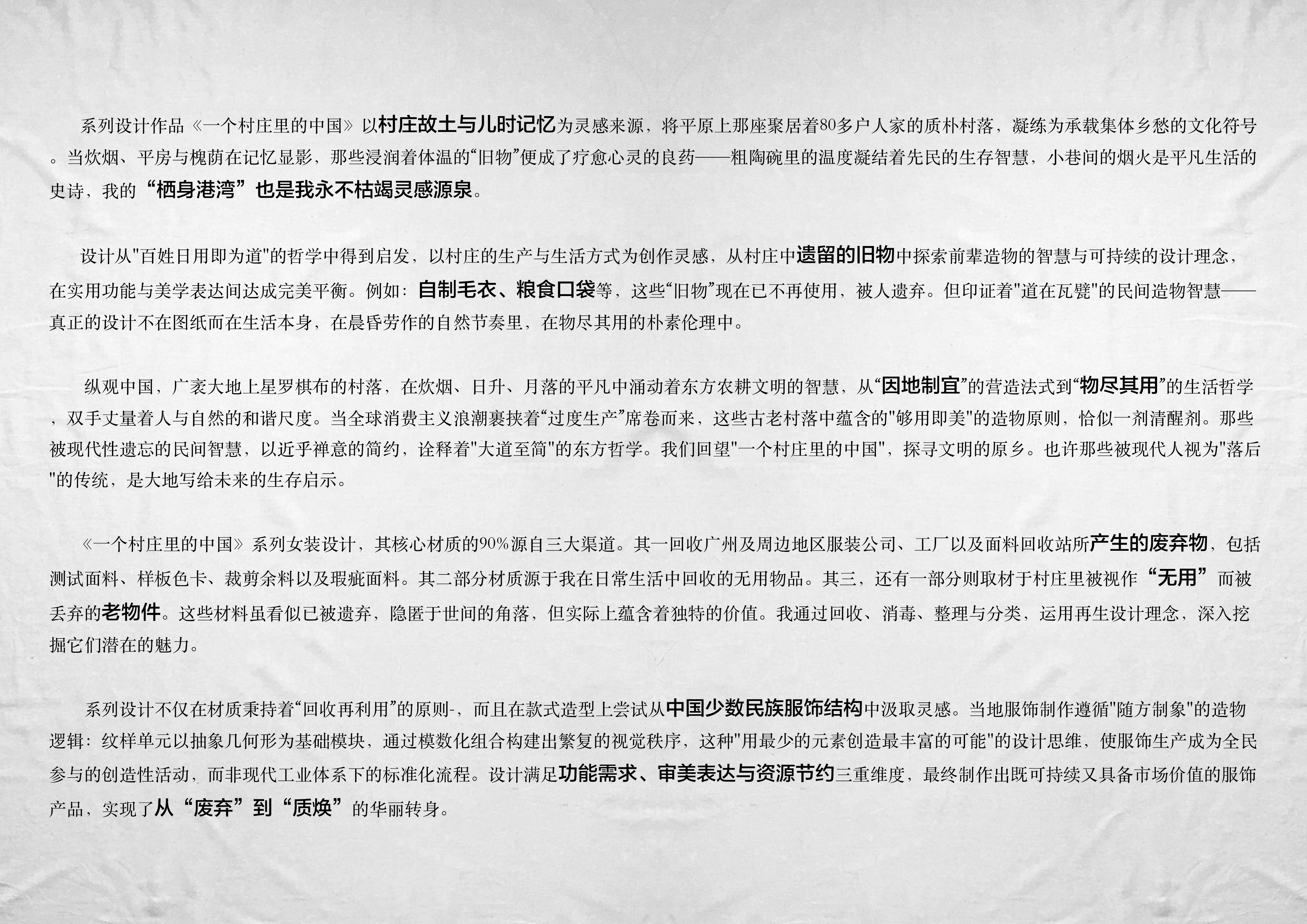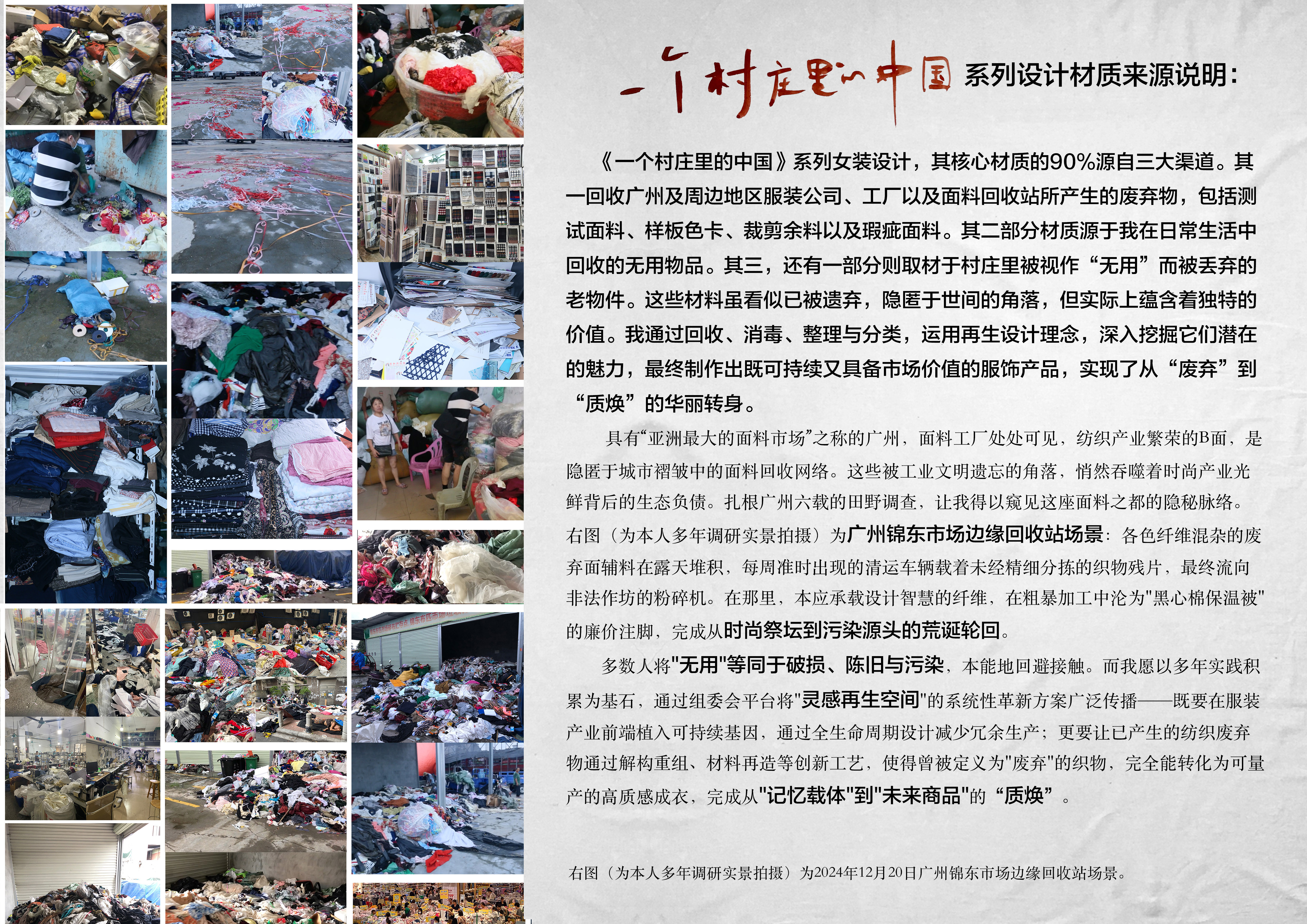 The series design work "China in a Village" takes inspiration from the village's homeland and childhood memories, condensing the simple village on the plain where more than 80 households live into a cultural symbol that carries collective nostalgia. When the smoke from cooking, the bungalows, and the shade of locust trees are reflected in memory, those "old things" soaked in body temperature become the medicine that heals the soul - the temperature in the coarse pottery bowl condenses the survival wisdom of the ancestors, the fireworks in the alleys are the epic of ordinary life, and my "living harbor" is also my inexhaustible source of inspiration. The "China in a Village" series of women's clothing designs, with 90% of its core materials sourced from three major channels. One method is to recycle the waste generated by clothing companies, factories, and fabric recycling stations in Guangzhou and surrounding areas, including test fabrics, sample color cards, cutting scraps, and defective fabrics. The second part of the material comes from the useless items I recycle in my daily life. Thirdly, a portion of the materials are taken from old items that are considered "useless" and discarded in the village. Although these materials may seem abandoned and hidden in corners of the world, they actually contain unique value. I use the concept of regeneration design to deeply explore their potential charm through recycling, disinfection, sorting, and classification.